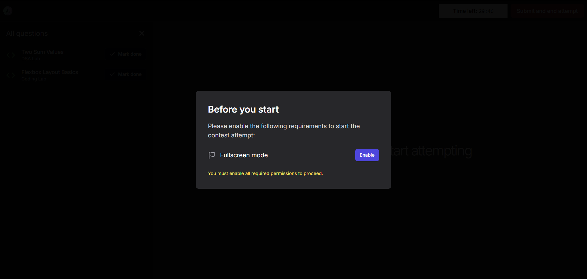 Users must also enable Fullscreen Mode and allow access to their camera and microphone if proctoring is enabled.