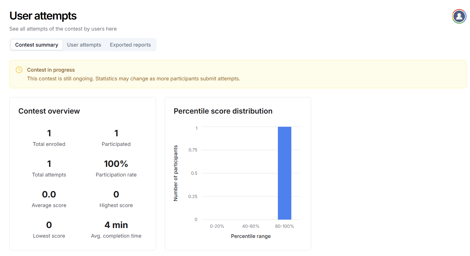 The Contest Summary provides instructors with a quick overview of participant engagement and performance metrics. Here, you can monitor the overall status of the contest, including how many users are Total enrolled, how many have Participated, and the Total attempts submitted. Key performance indicators such as Average score, Highest score, Lowest score, and Avg. completion time help you gauge overall difficulty and participant performance. The Percentile score distribution (0–20%, 40–60%, 80–100%) gives a clear picture of how participants are performing relative to each other.