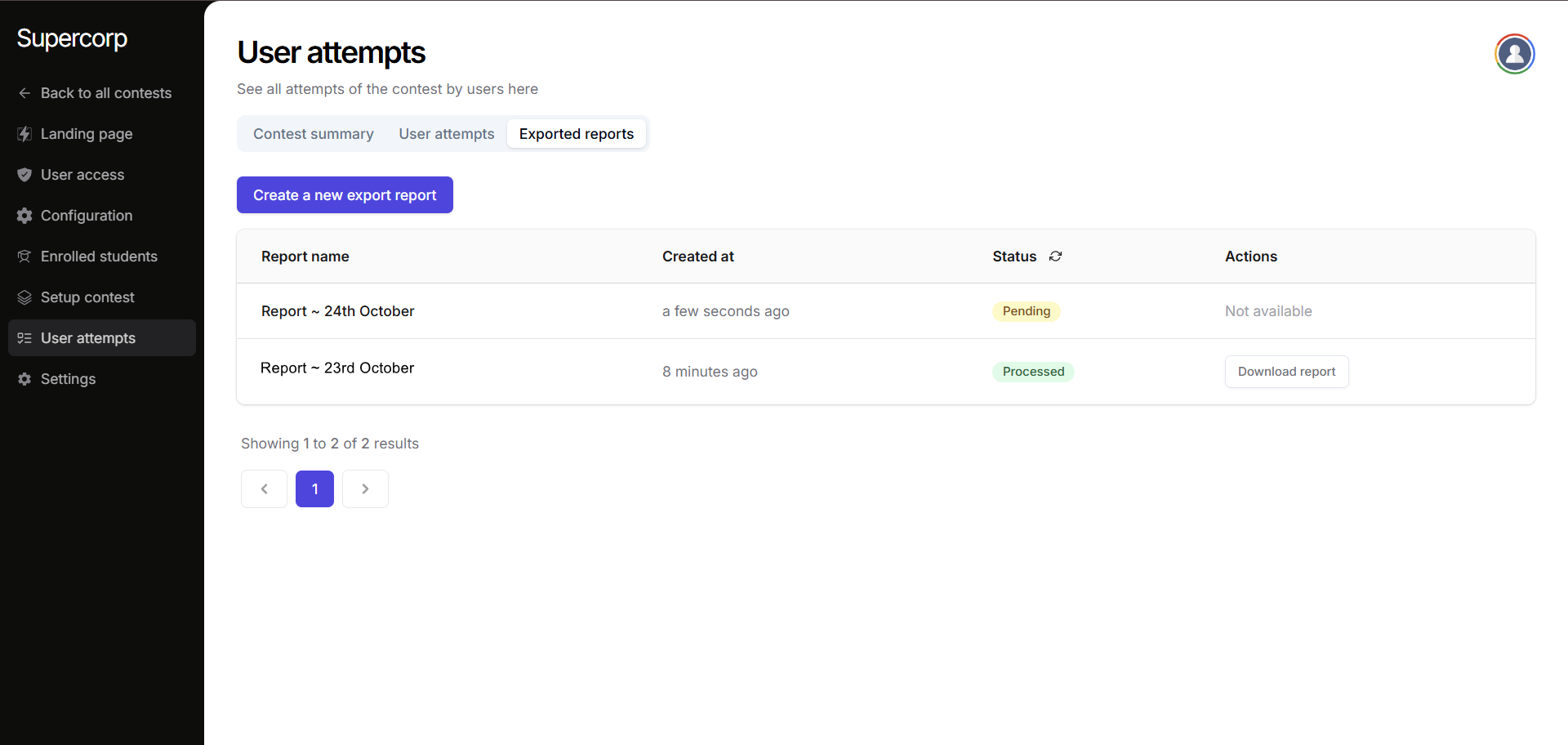 To download reports:- Go to the Exported reports tab within your contest user attempts section.