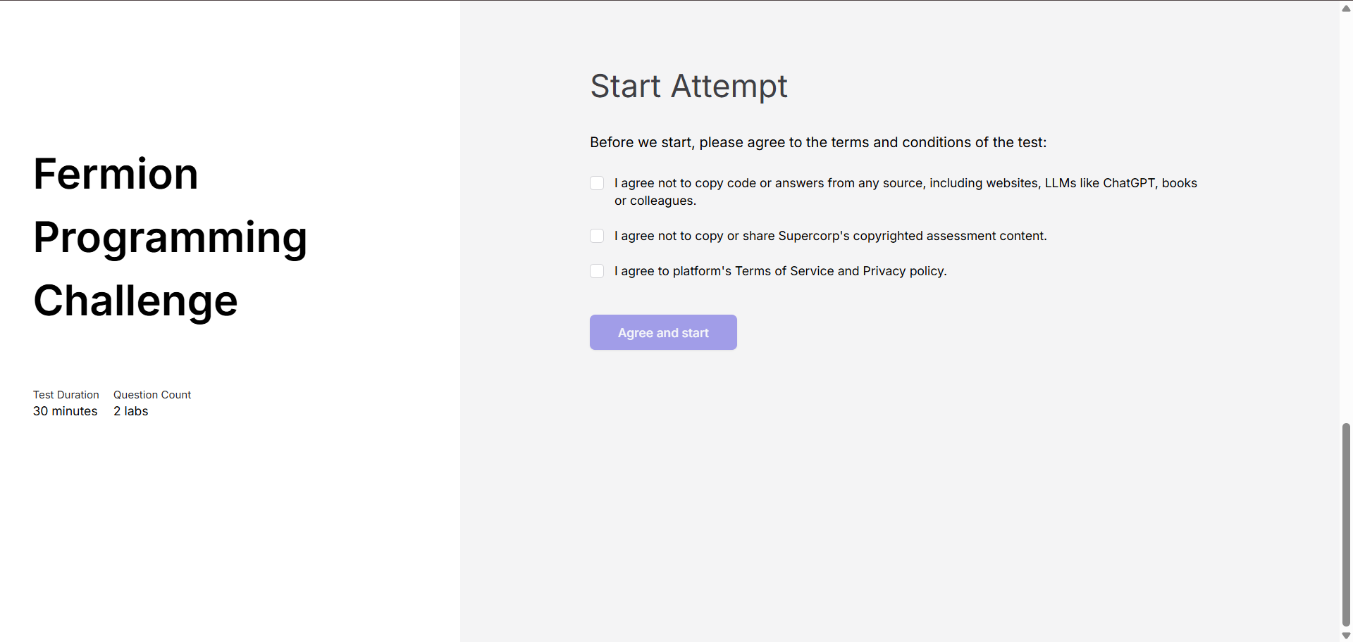 Before beginning the contest, users must agree to the Terms and Conditions. Typical agreements include:- Not copying code or answers from any source, including websites, LLMs like ChatGPT, books, or colleagues.