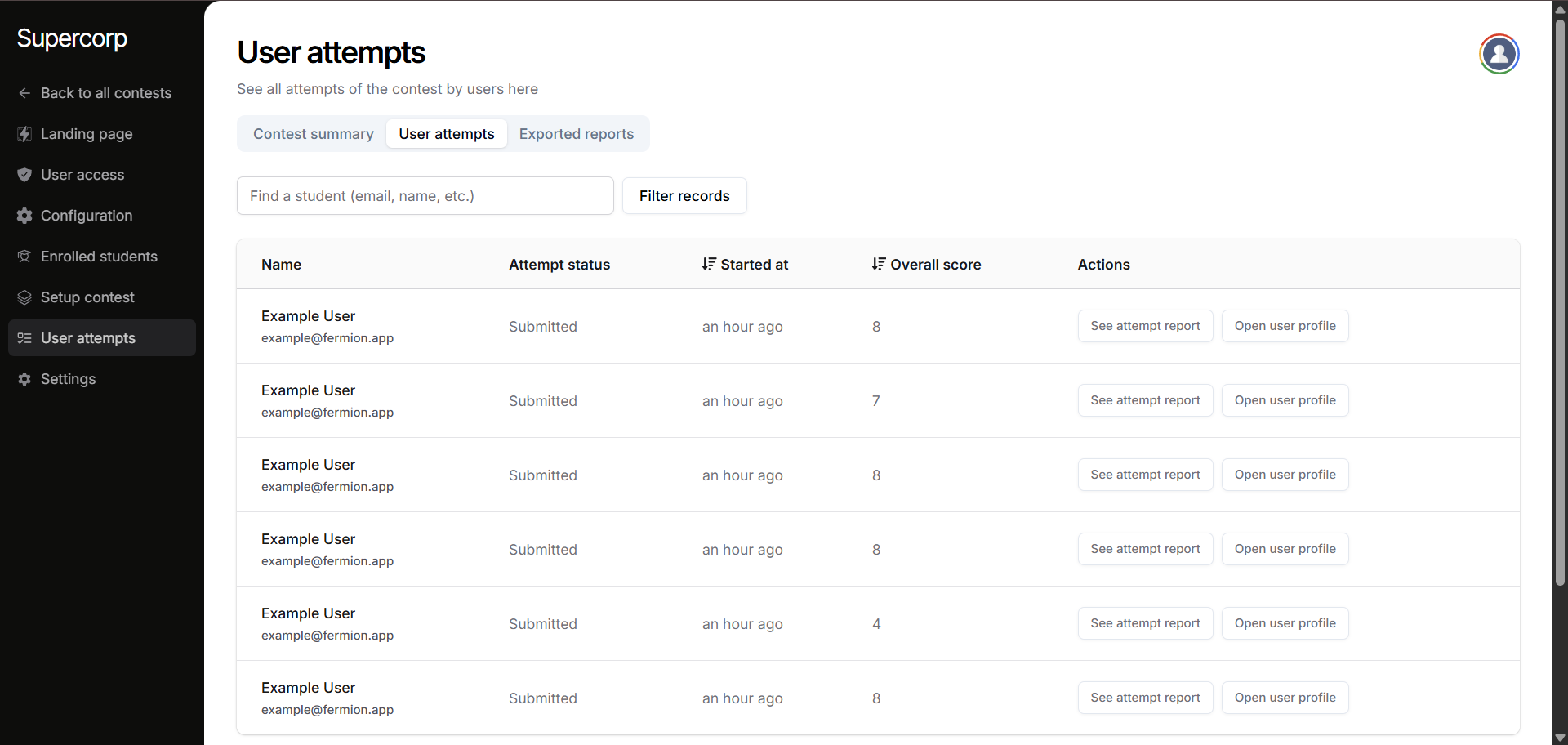 Navigate to the User Attempts tab in the sidebar to access all the results and reports of the contest.