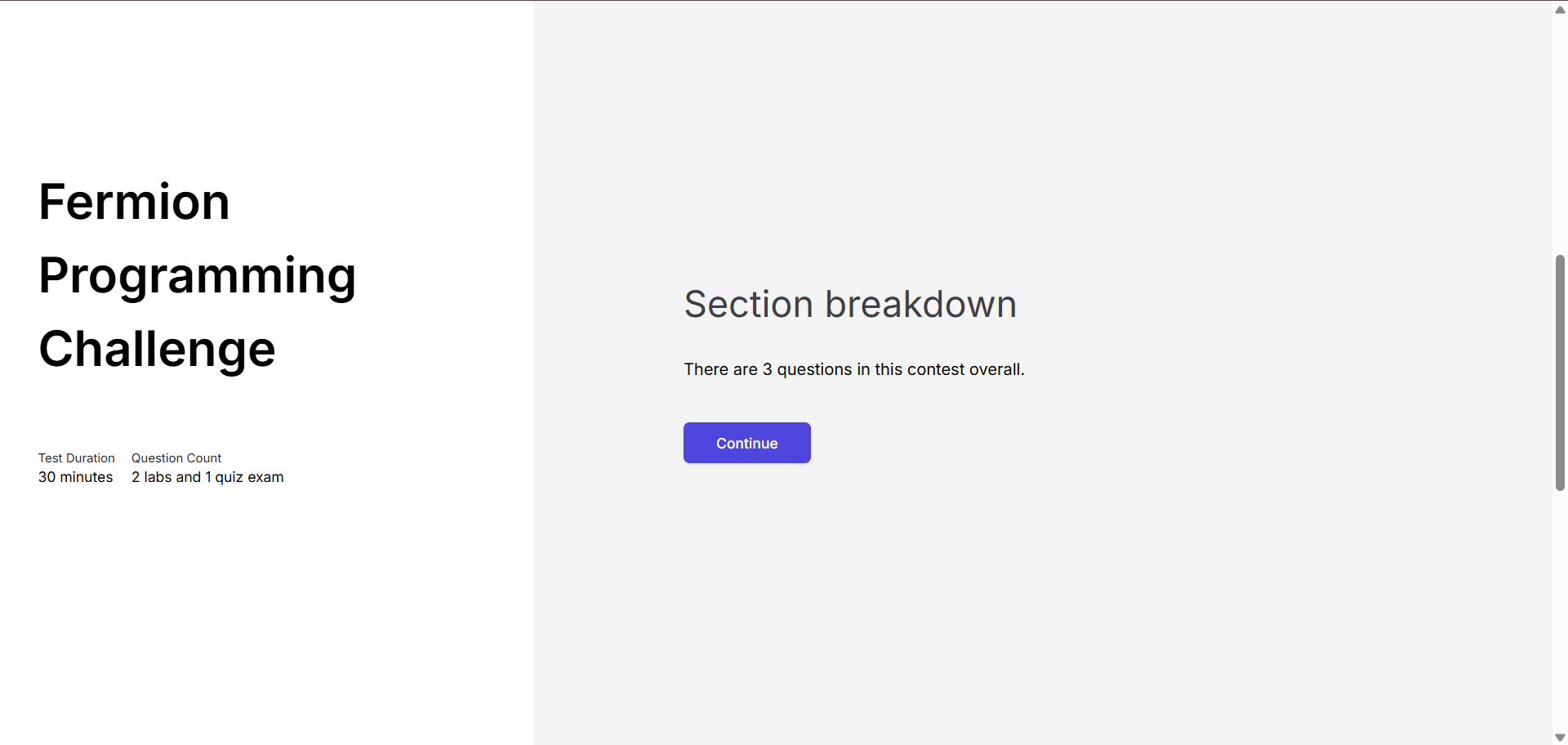 After the instructions, users see a Section Breakdown, which provides an overview of all questions in the contest. This allows the user to understand the total number of questions and plan their approach.