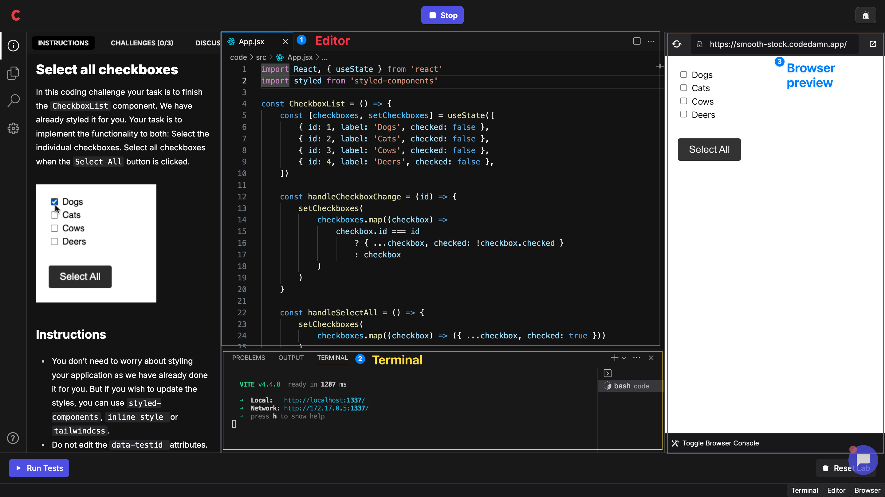 Another mind-boggling reason why Fermion stands out among other traditional LMS platforms is its ability to integrate interactive coding labs at the click of a button!Coding labs on Fermion are highly powered linux environment which boot in under 3 seconds, and give learners almost a VSCode-like experience on web. These labs are highly interactive and evaluative in nature, let’s look at a coding lab below:This lab includes a powerful editor, terminal and browser preview.Alongside, it also includes an Instructions and Challenges section so that students know exactly what they have to do when they land on your lab.We make sure that when you are teaching a technical concept, students aren’t simply just learning, but they’re learning by doing. These labs force students to solve hands-on, what they’ve just learnt by you.We believe in the philosophy of learning by doing, and we’ve brought the same concept to Fermion by letting technical you integrate hands-on interactive and evaluative coding labs in seconds.With over 5000+ coding labs and quiz questions available, you can easily add interactive and evaluative elements to your courses.This helps your courses stand out in the market by offering a practical learning experience that is crucial for aspiring developers.Not just this, you can go beyond and even add hands-on coding projects as well as interview kits inside your courses.