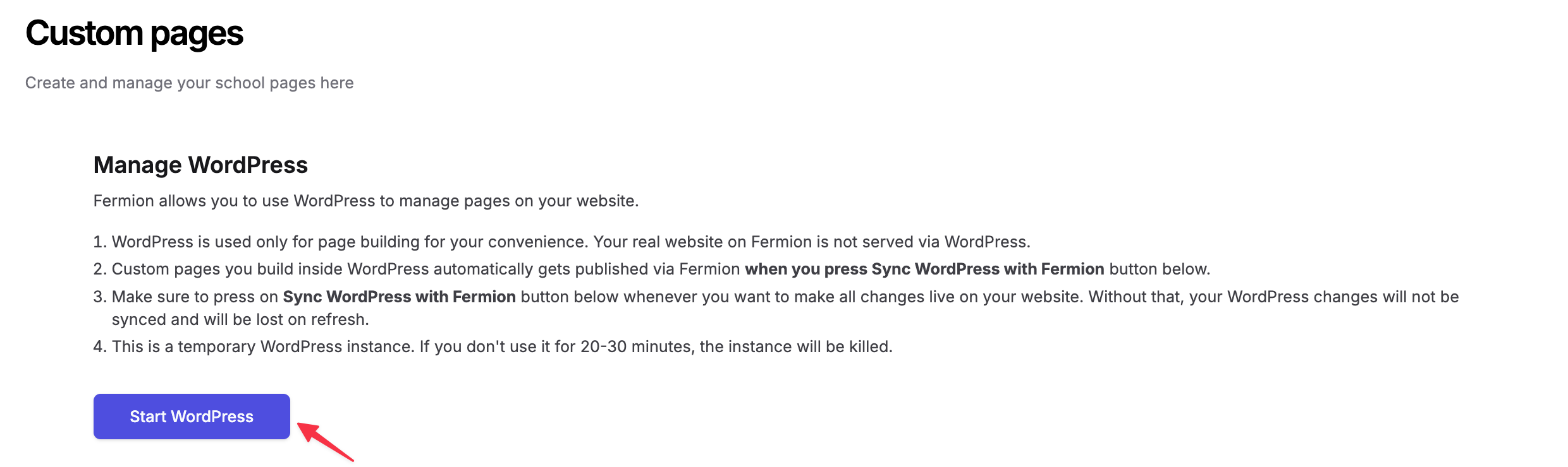 Custom Pagesinside the tab, and click onStart WordPress. -