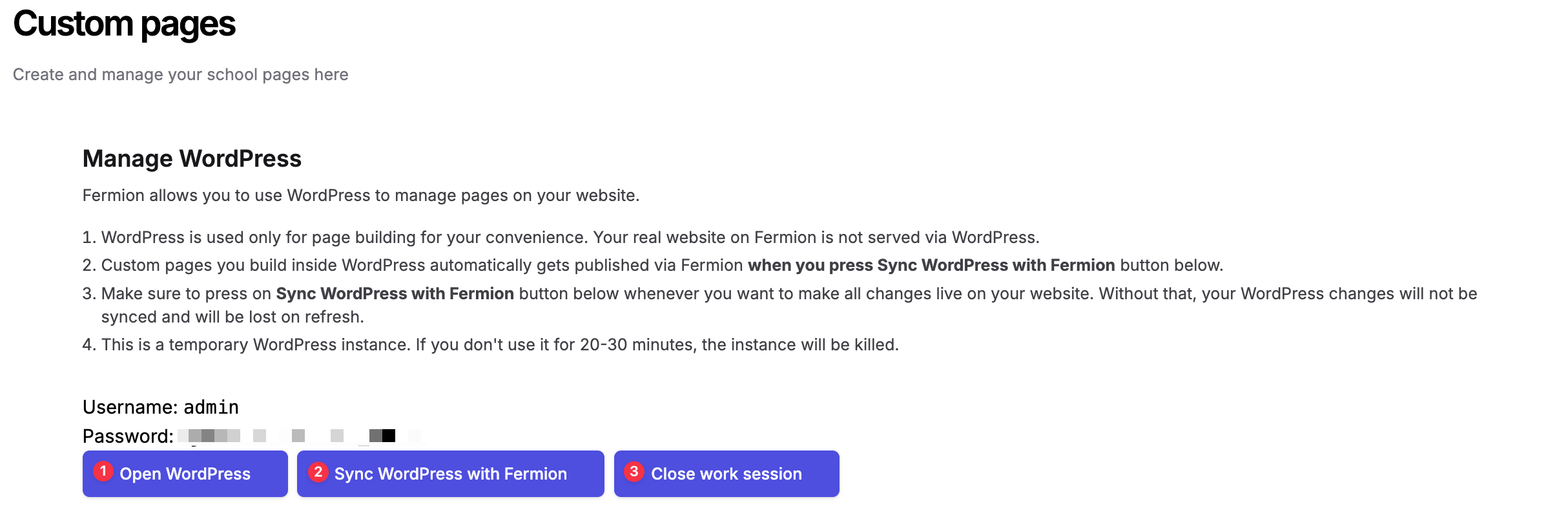 - Make sure to Sync WordPress with Fermion whenever you want to make all changes live on your website. Without that, your WordPress changes will not be synced and will be lost on refresh.