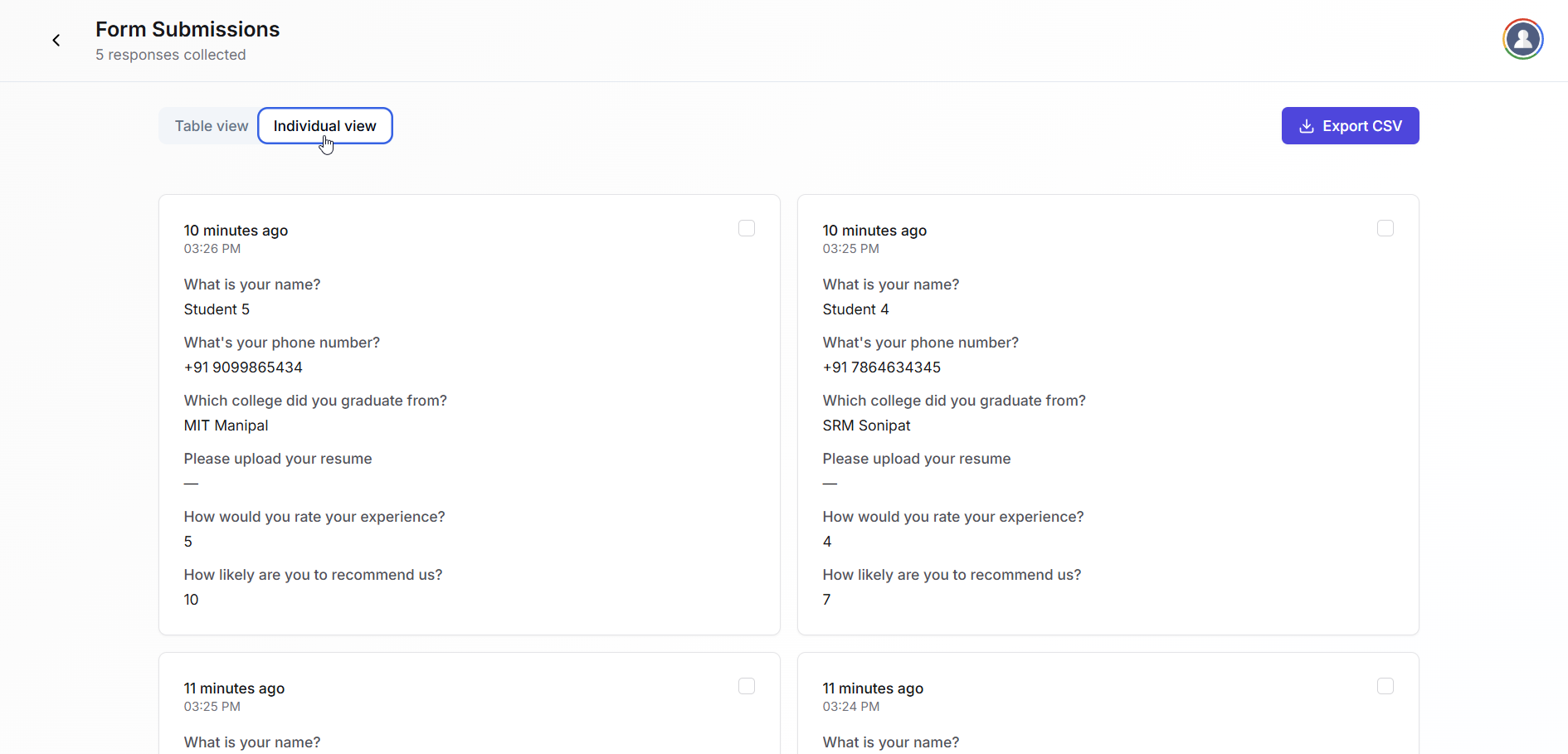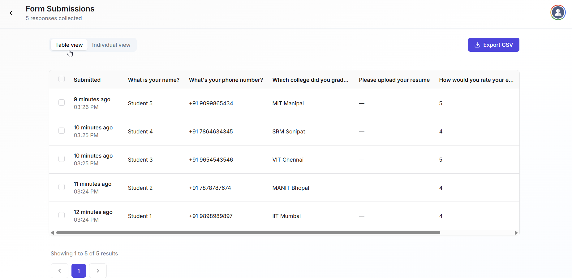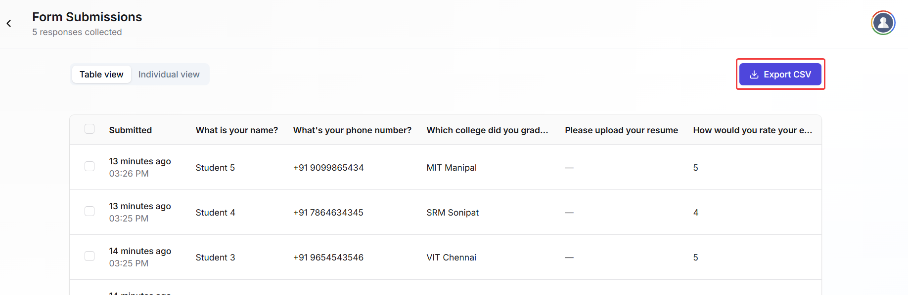 Fermion allows you to view submissions in both Individual View and Table View, and export the data in CSV format for offline analysis.