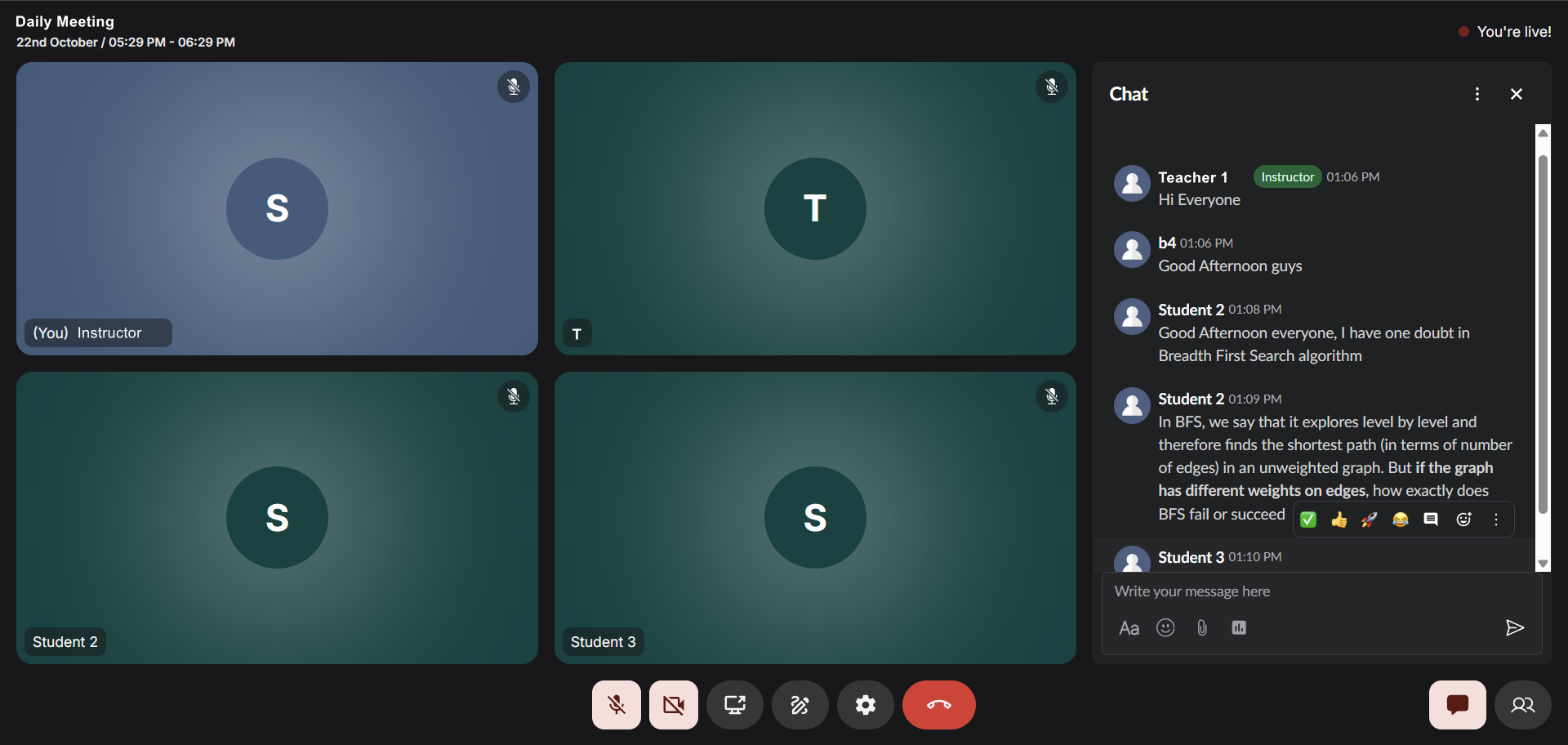 The chat system is designed to handle high-volume conversations with thousands of participants simultaneously, ensuring smooth communication even in large-scale live sessions. Messages are delivered instantly, allowing for dynamic Q&A sessions, quick clarifications, and spontaneous discussions that enhance the learning experience.Instructor and student engagement