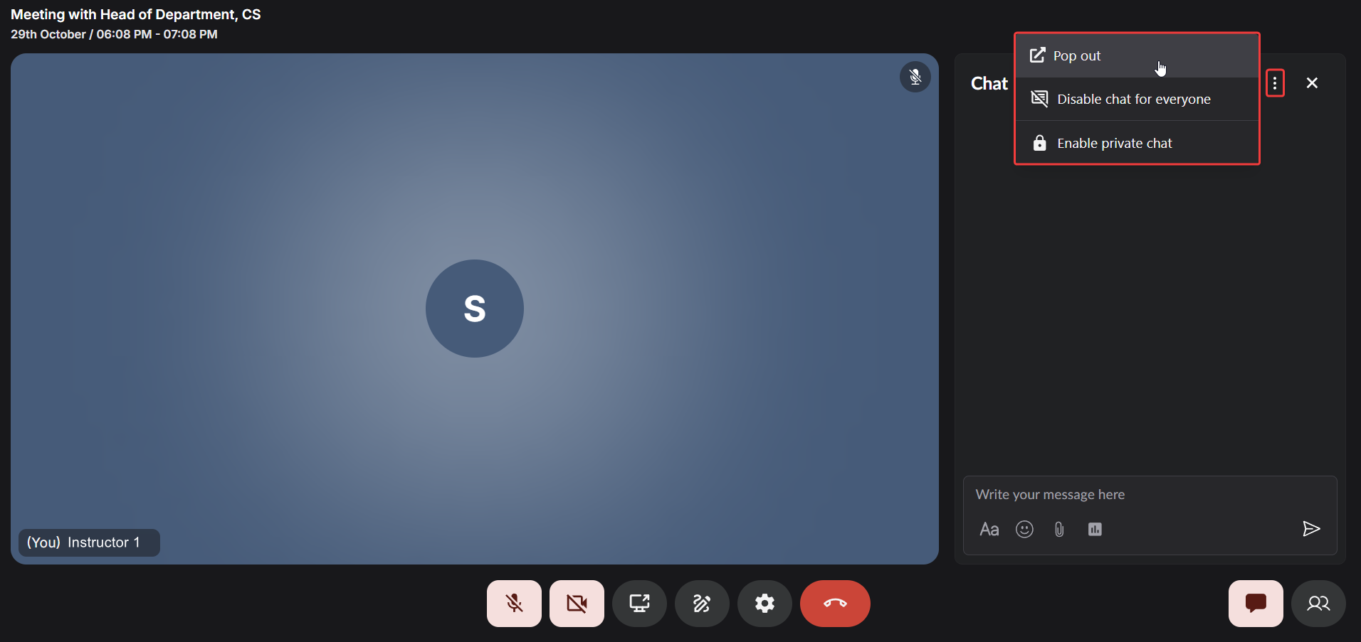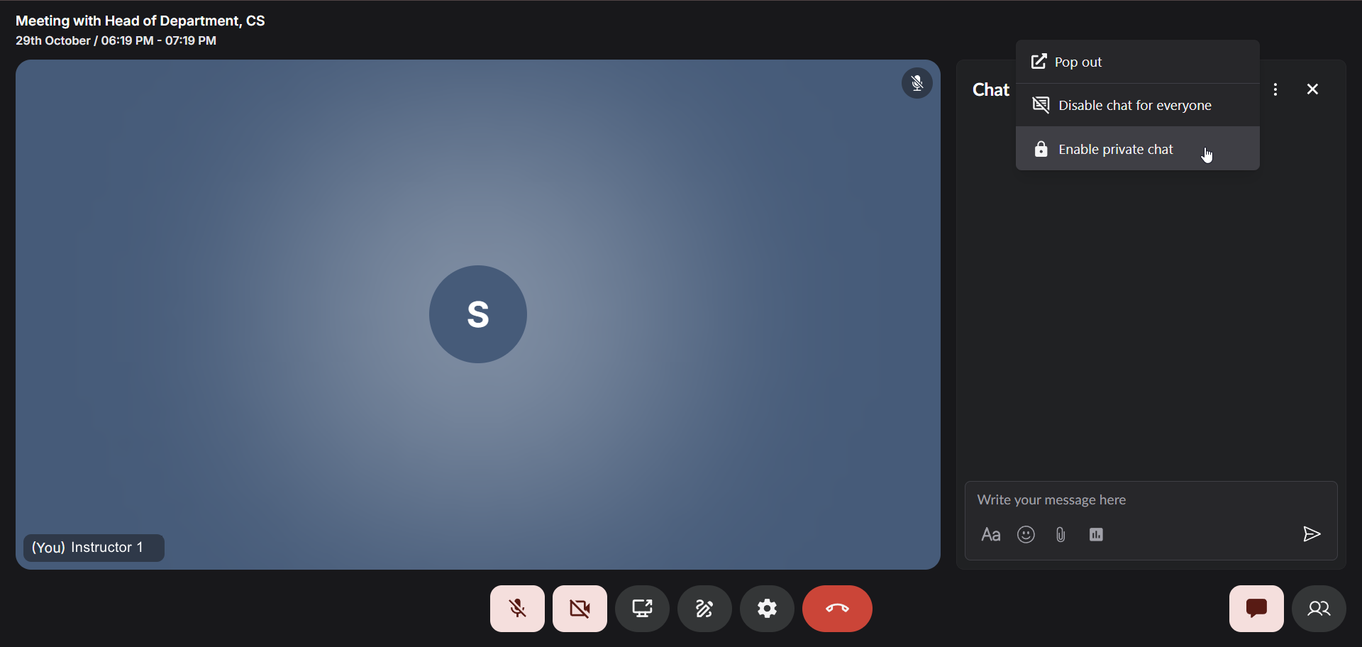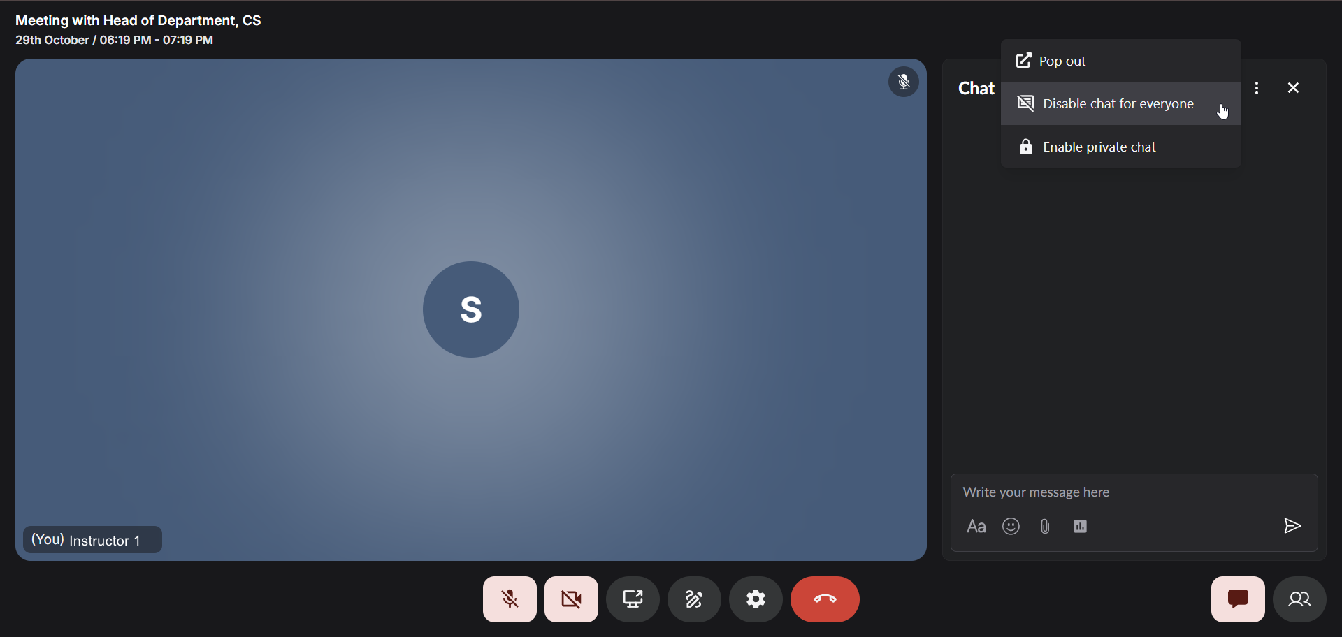 Instructors can now temporarily disable the chat for all participants with a single click. This is especially useful during important explanations, presentations, or assessments where focus is essential. When disabled, all participants will see a message indicating that chat is currently unavailable until re-enabled by the host.