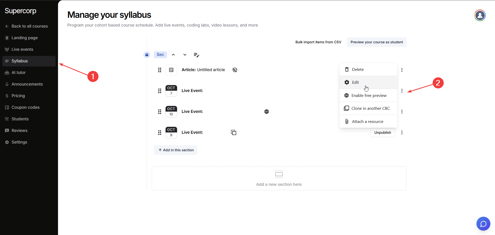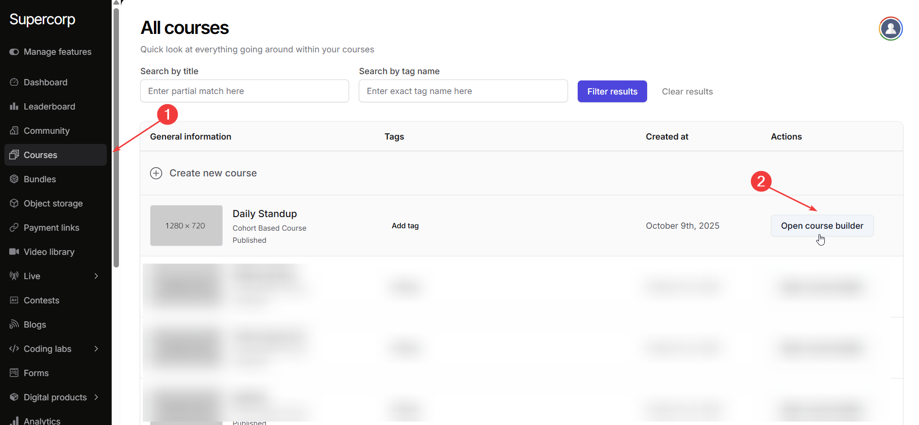 Head over to the Courses tab in your instructor dashboard sidebar and open the course builder for the respective live stream session’s parent course.