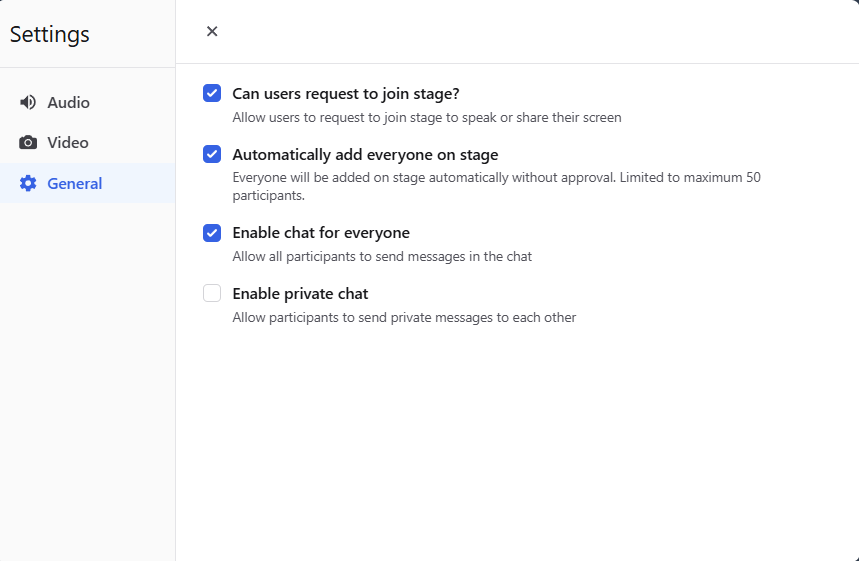 When this option is enabled, participants can request to join the stage during a livestream. This allows them to share their audio, video, or screen with the host and other attendees. -