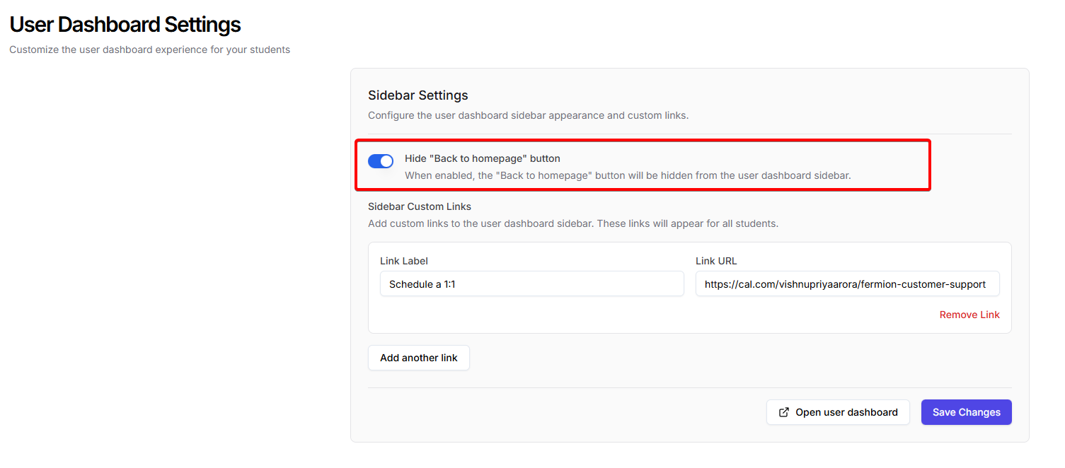 If you want a more focused user dashboard, you can choose to hide the Back to homepage button for students. Toggle the Hide Back to homepage button setting while editing your user dashboard links.