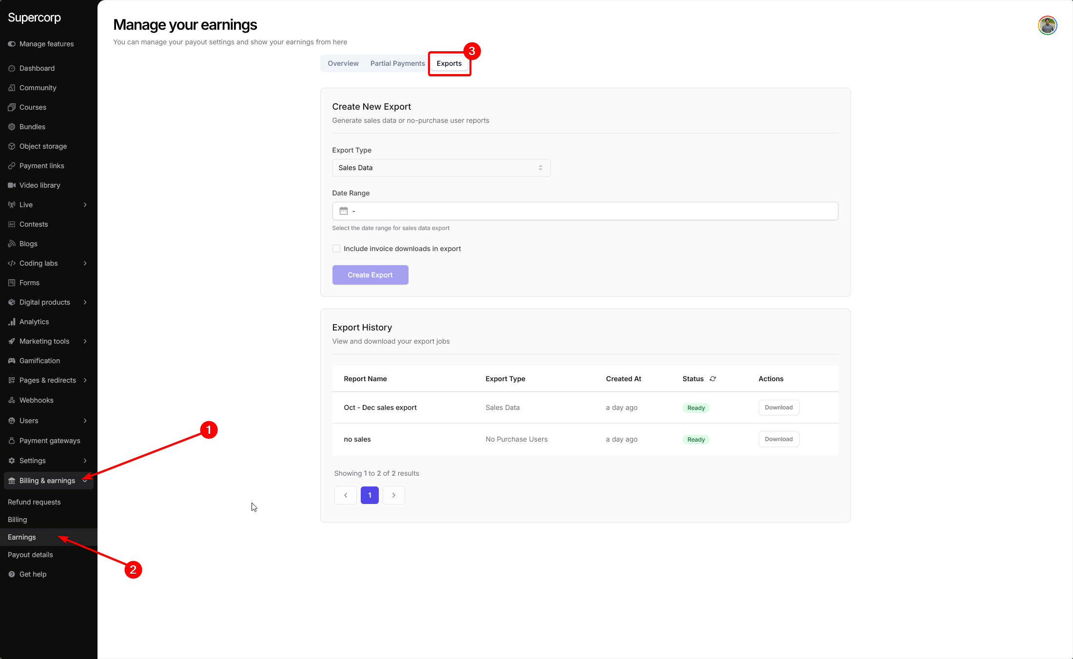 You can export sales and user data from your earnings dashboard for accounting, compliance, or analytics purposes. Here’s how to access and use the export functionality:1