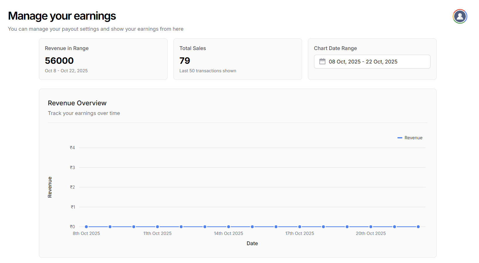 The top section of your earnings dashboard displays your revenue trends and total sales within a selected date range.You can easily switch the date range (for example, Oct 8 - Oct 22, 2025) to see how your income changes over time.