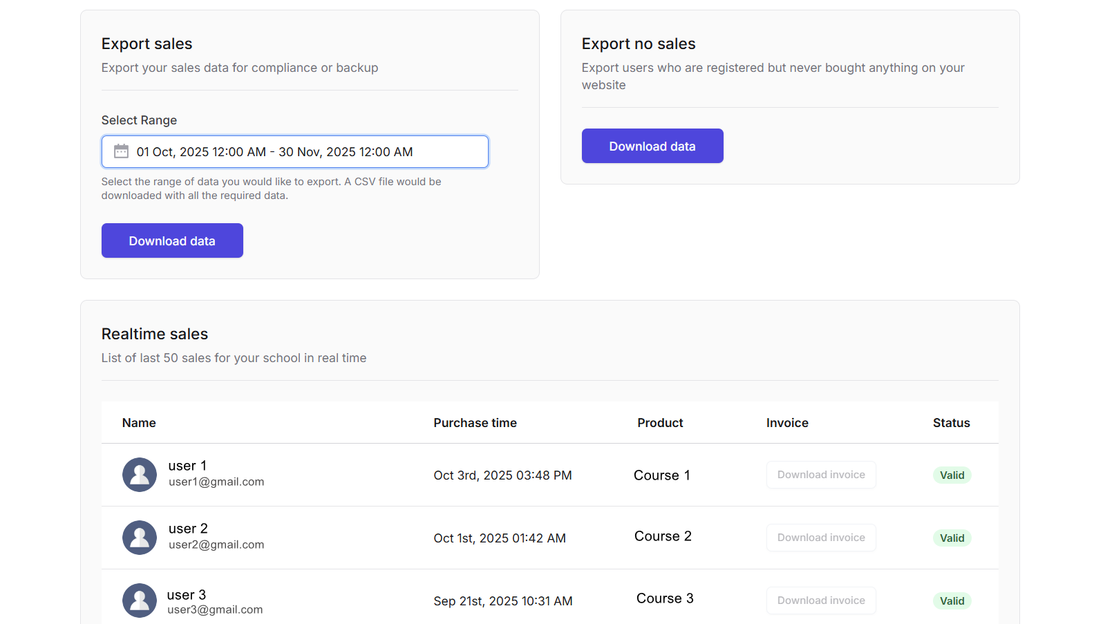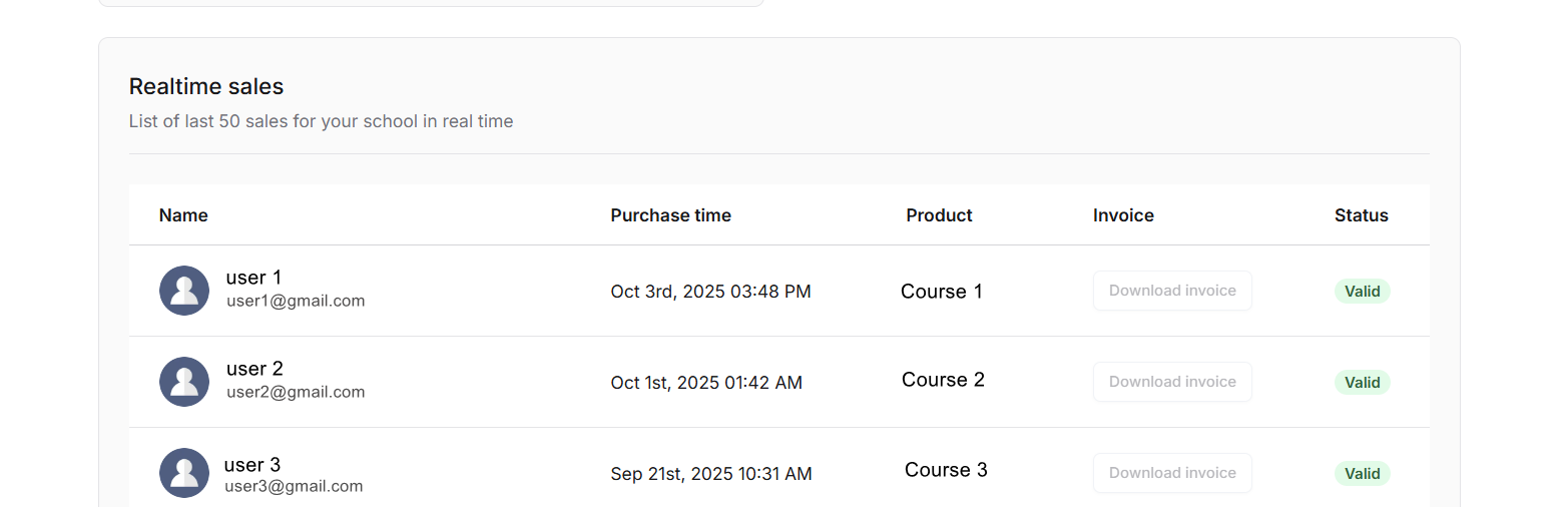 The Realtime Sales section lists your most recent transactions (up to the last 50 sales) in real time. This view helps you stay up to date with every purchase that happens on your platform without waiting for daily summaries or exports.