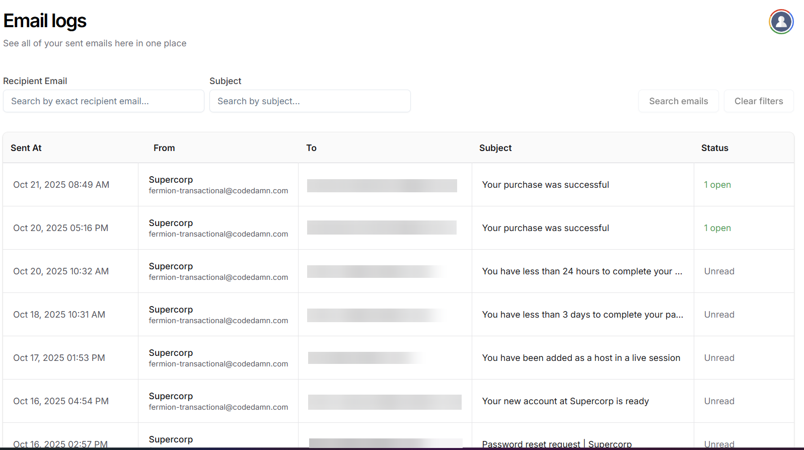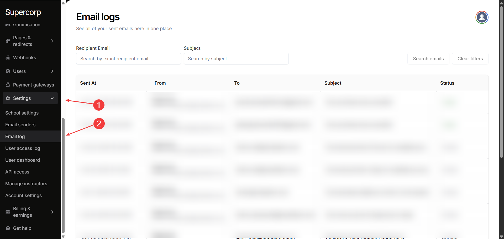 In your instructor dashboard sidebar, go to Settings → Email Log. This will open the email log dashboard where you can view all sent emails.