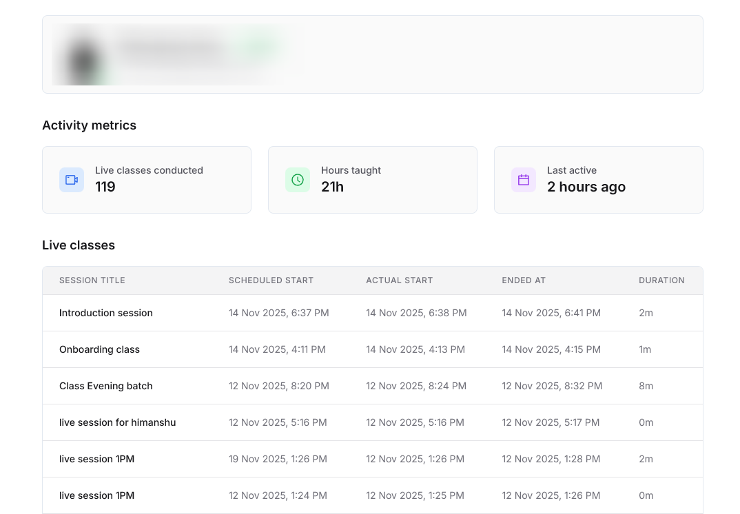 Below the activity metrics, you’ll see a detailed table listing the instructor’s most recent live classes. This table provides an overview of each session, including its title, scheduled and actual start times, end time, and total duration. Use this information to quickly understand the instructor’s teaching activity and attendance patterns. Refer to the example image above for a preview of how this data is presented.