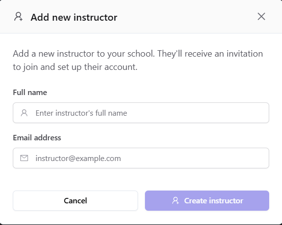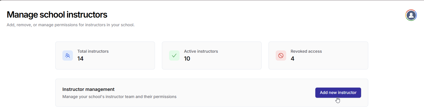 Managing your school’s instructors is simple and efficient. You can add new instructors, update their profiles, adjust their permissions, or revoke access when needed. This ensures that only authorized instructors have access to your school’s resources, keeping your team organized and your school secure.1