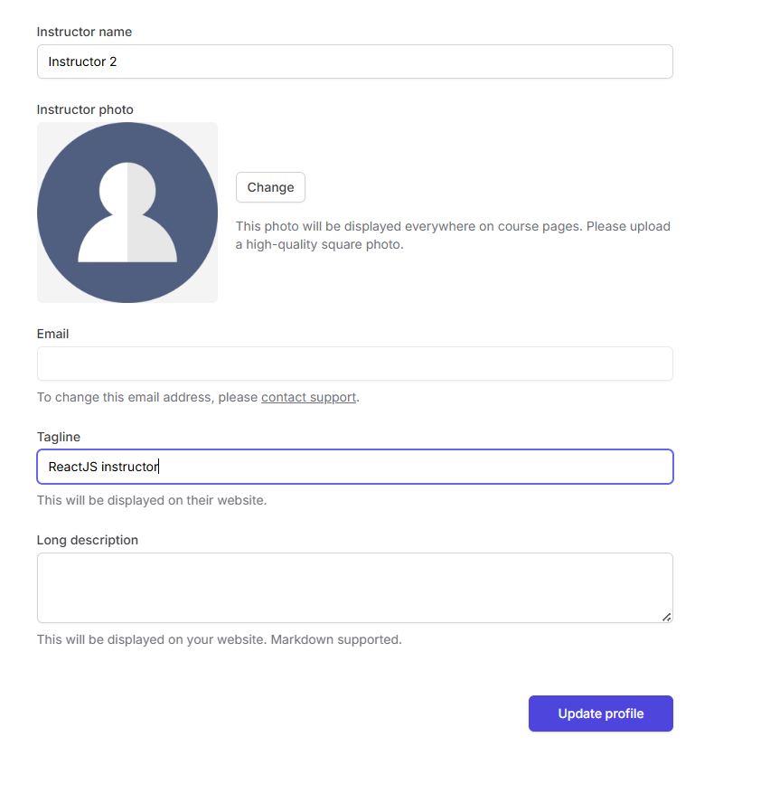 A short description or title for the instructor, e.g., “ReactJS Instructor.” This will appear on their public profile page and can help highlight expertise. -