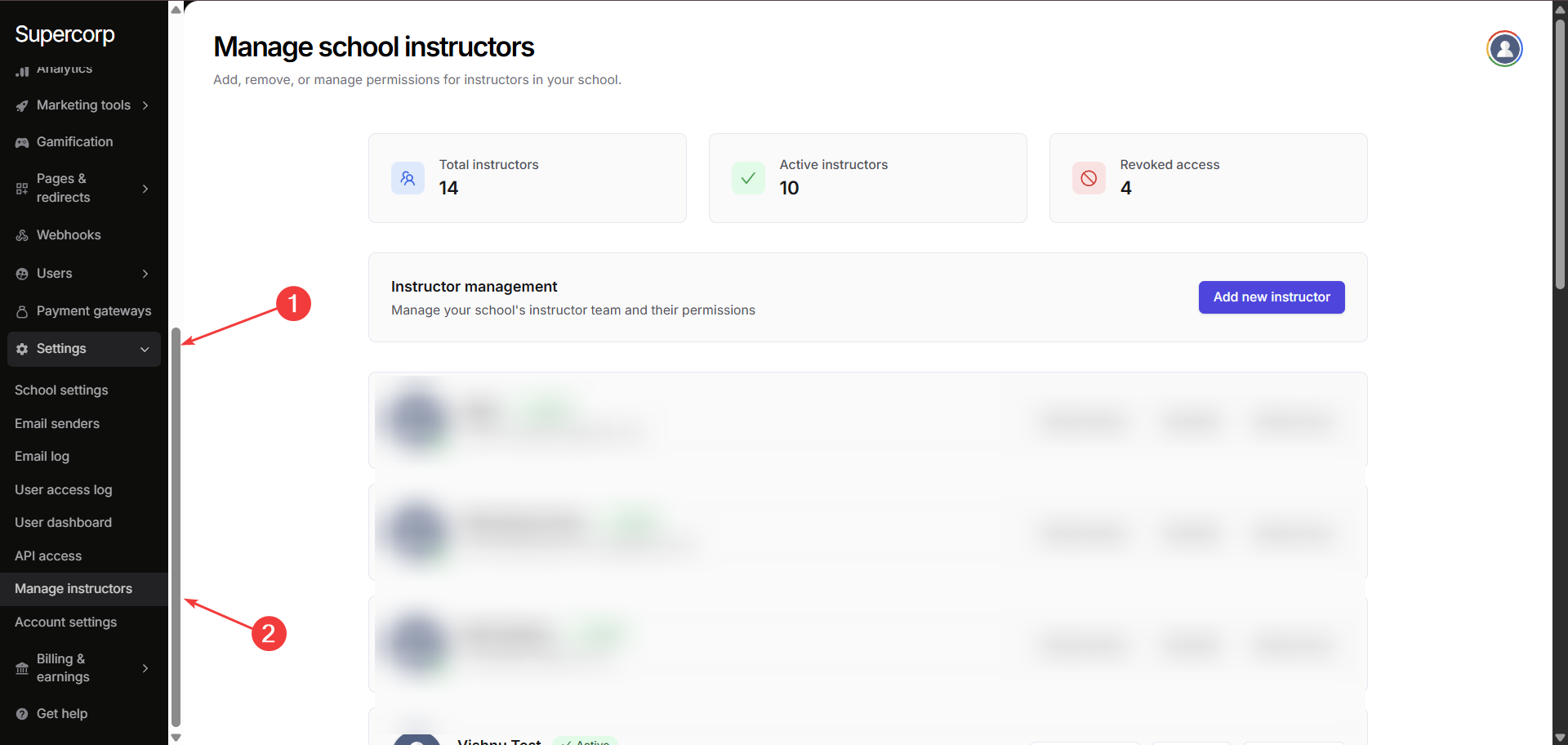 In your sidebar, go to Settings → Manage Instructors. This will open the instructor management dashboard.