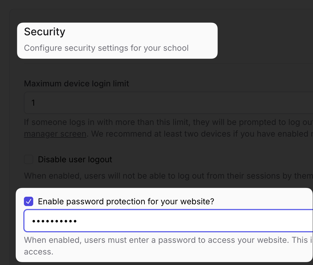 You can enable password protection from the Security section in School Settings.This will temporarily restrict access to your site by setting a global password. Users must enter this password before viewing your site or logging in.This feature is ideal for: