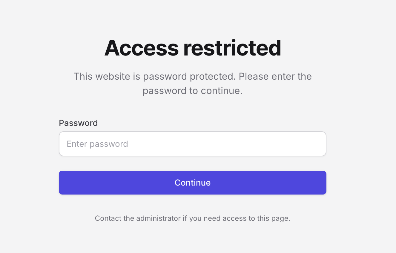 Password protection allows you to temporarily restrict access to your site by setting a global password. Users must enter this password before viewing your site or logging in.