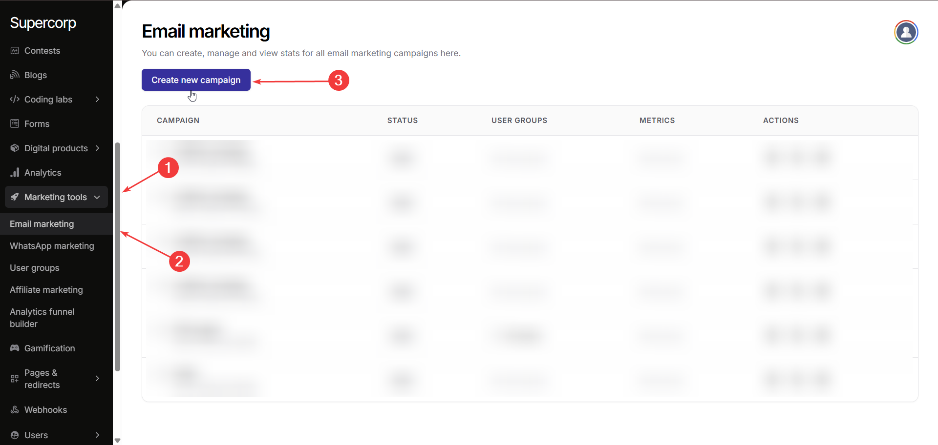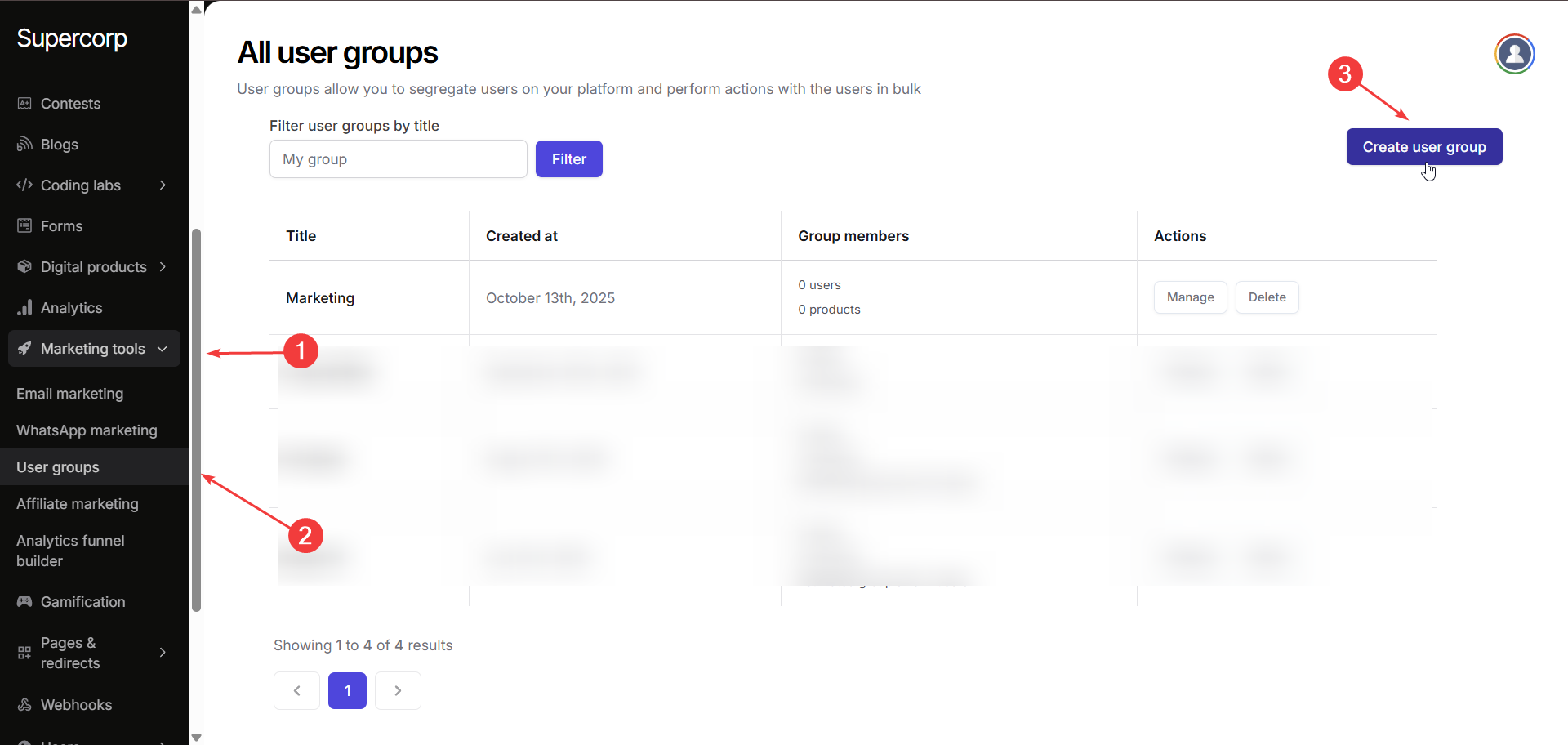 Head over to Marketing Tools in your Instructor Dashboard sidebar and click on User Groups. Here, you can either edit an existing user group or create a new one by clicking the Create user group button.