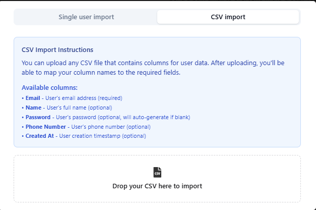 Alternatively, you can upload a CSV file containing user data to import multiple users at once. The CSV should include these columns: