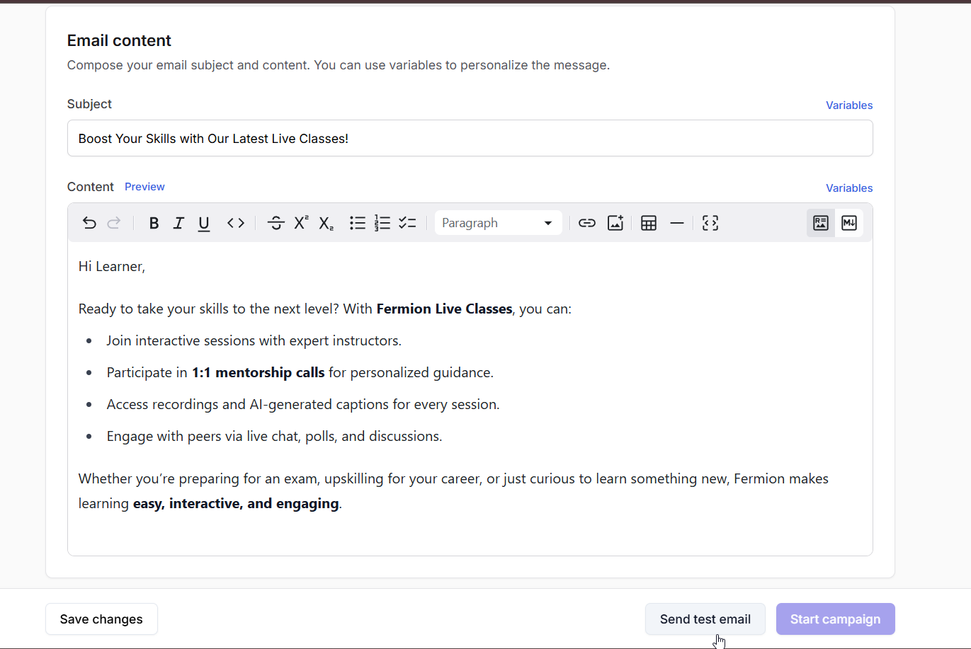 Email marketing in Fermion can be applied in numerous scenarios. For instance, you can send onboarding emails to new learners, course reminders before live sessions, or promotional offers for advanced courses.Next steps