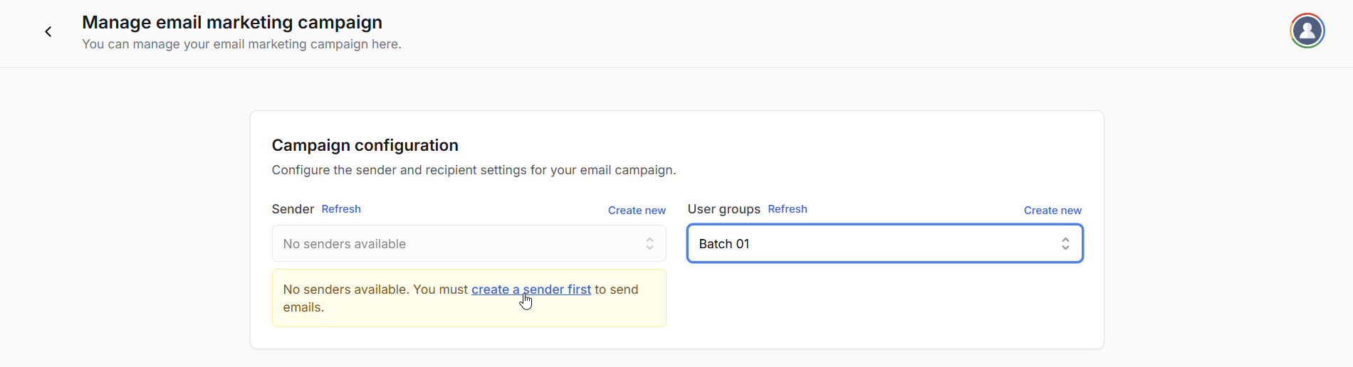 Select the user group you want to target for this campaign. This ensures that your emails reach the right audience segment. Make sure you have a sender available for your emails. For instructions on enabling email senders with the help of your domain, refer to email sender configuration docs