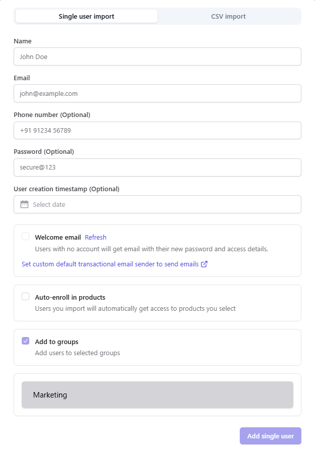 You can select the creation date, enable a welcome email, and set a custom default transactional email sender. Users imported this way can also be auto-enrolled in products and added to selected groups. Users without accounts will automatically receive their password and access details via email.