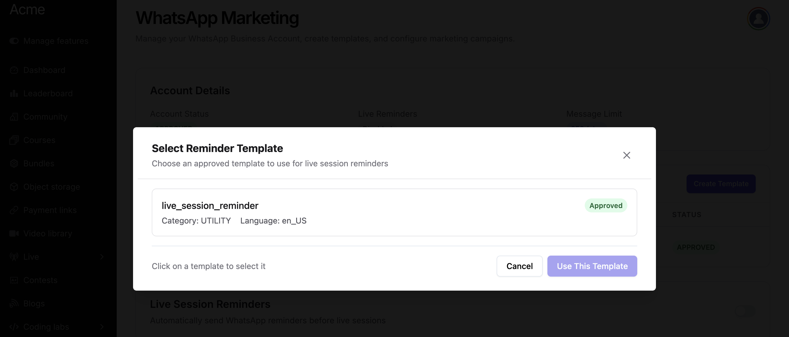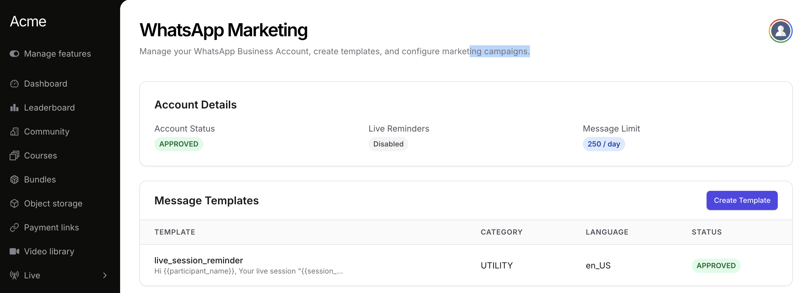 Once your WhatsApp Business account is connected to Fermion, you can start sending automated reminders for your live sessions. Follow these steps to create and link a WhatsApp message template for your class reminders.1