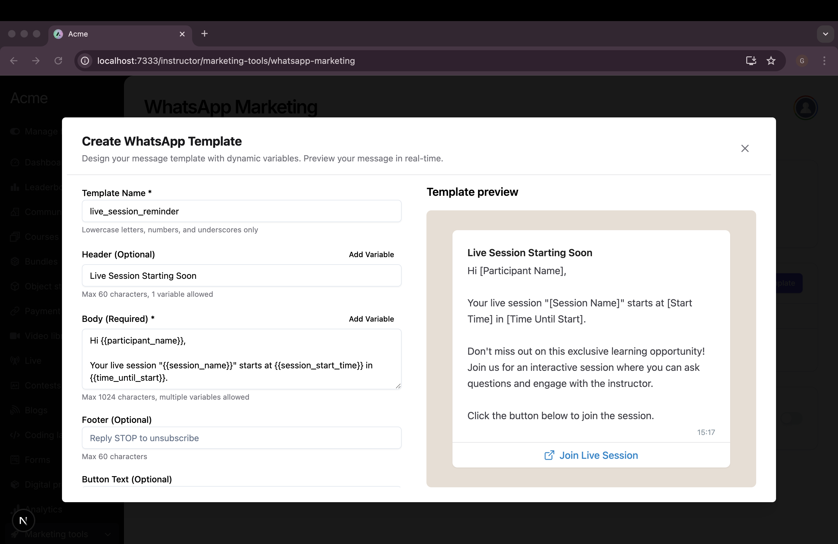 Go to the Message Templates section under Marketing Tools → WhatsApp Marketing and click Create Template.In this section, you can design a new message template using dynamic variables such as session name, start time, and participant name.