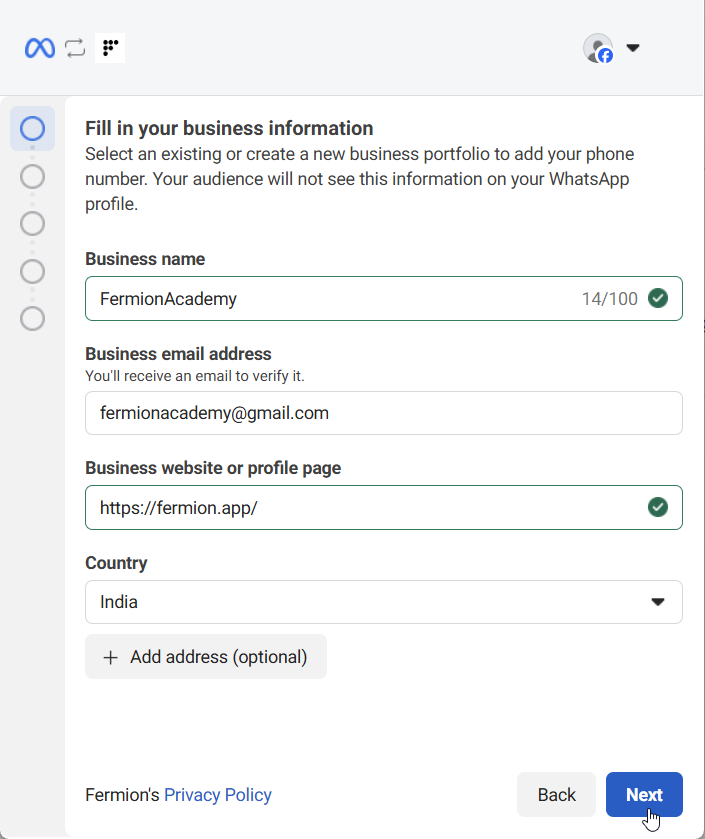 - Display Name: Fermion Academy - Example (should match business name and follow WhatsApp display name guidelines)