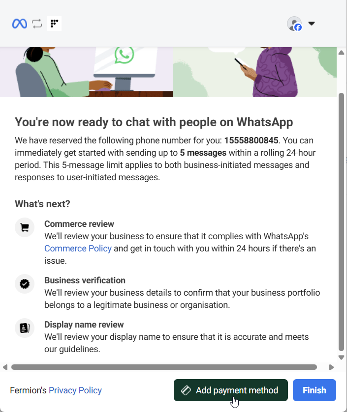 Click Finish. Your WhatsApp Business account is now linked to Fermion and ready to send live class reminders.