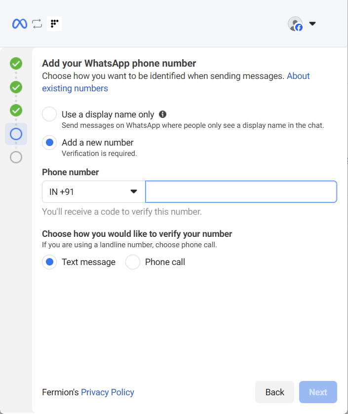 - Go ahead and verify WhatsApp number with the OTP provided by Meta.