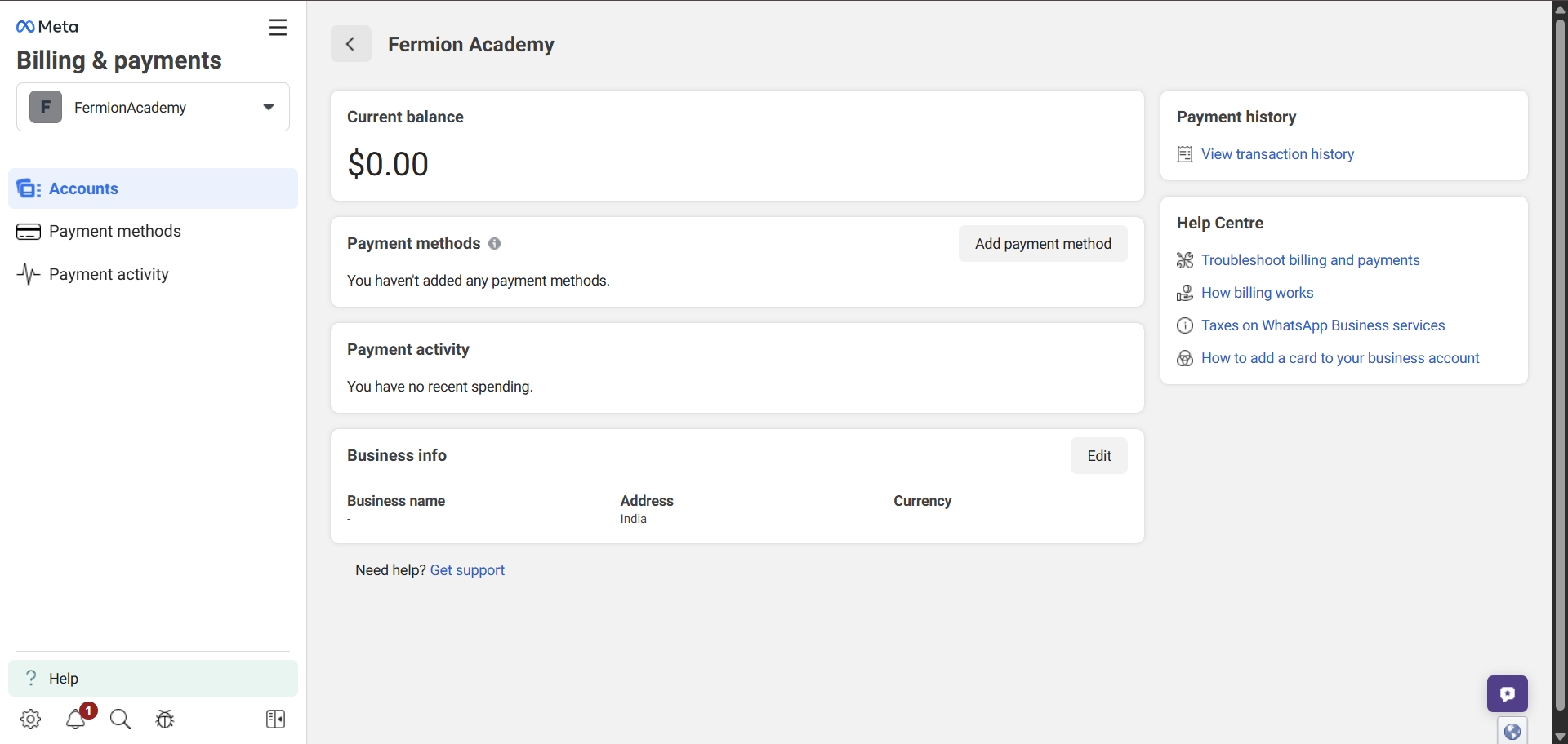 Before you can finalize the WhatsApp Business connection, you must add your business details, GST information, and a payment method.Make sure to:
