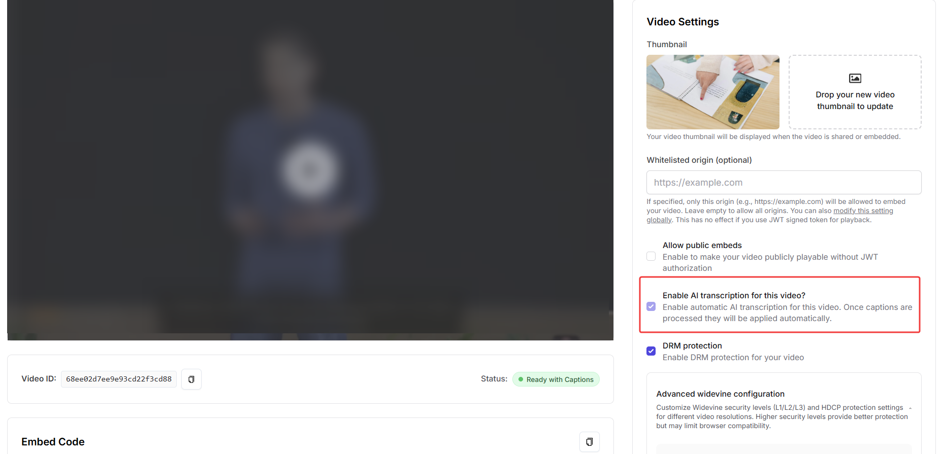 In the video settings panel, toggle the enable AI transcription for this video option to automatically generate captions in the same language used within the video.