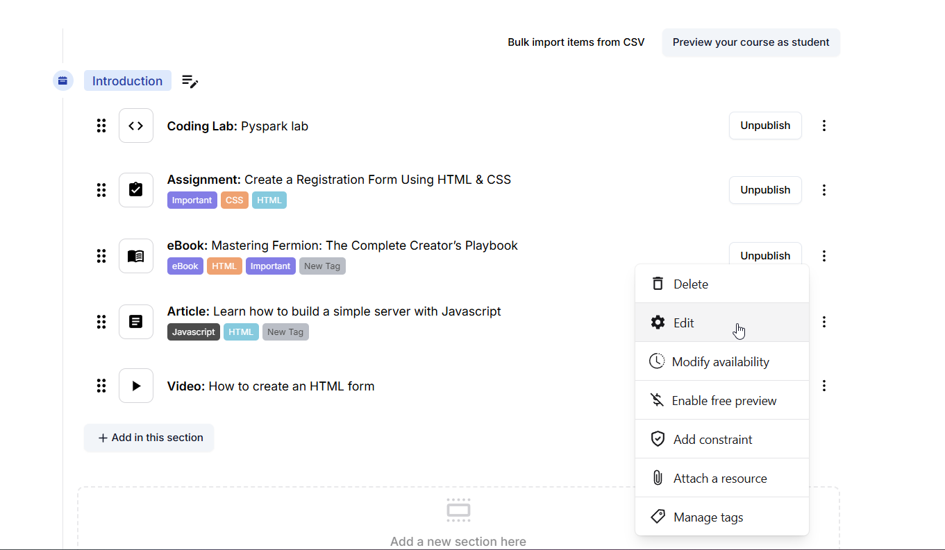 Click on the three dots (⋮) next to any video where you want to attach the quiz, then select Edit.