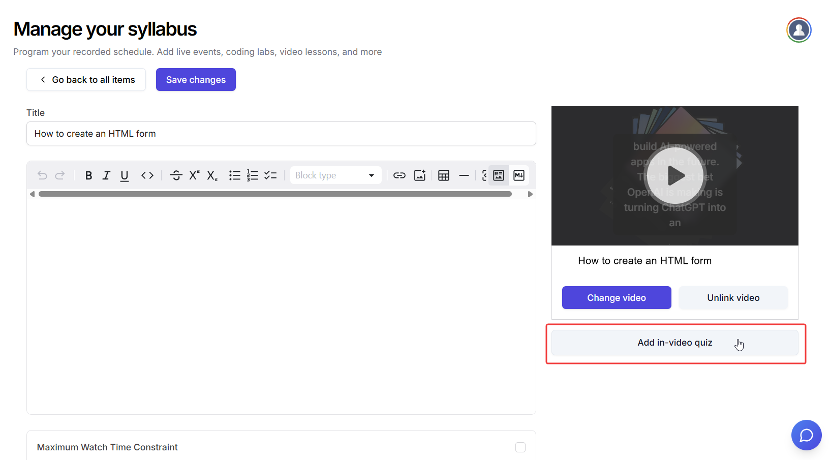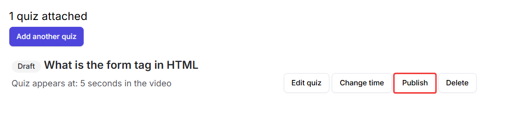 After adding all your questions, click on Save Changes and come out of the quiz builder to the in-video quiz section. Here, click Publish to attach this quiz to the video. Click on Change time to edit when the quiz appears in the video playback.