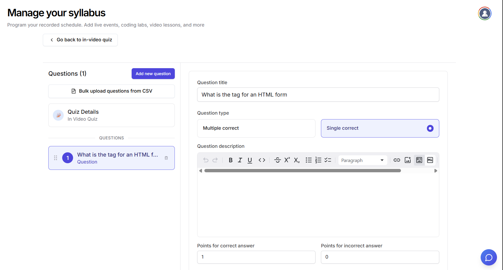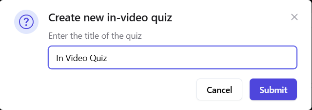 Click on the Edit button next to the quiz name and start creating questions for your quiz. You can also add a simple description for your in-video quiz.