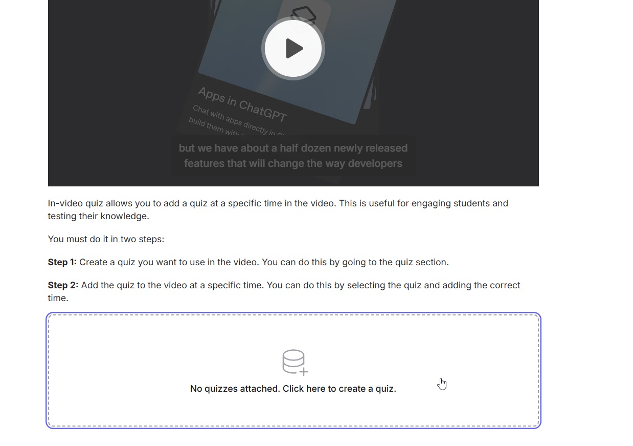 Scroll to the In-Video Quiz section and click the Create here to create a quiz dialog box.