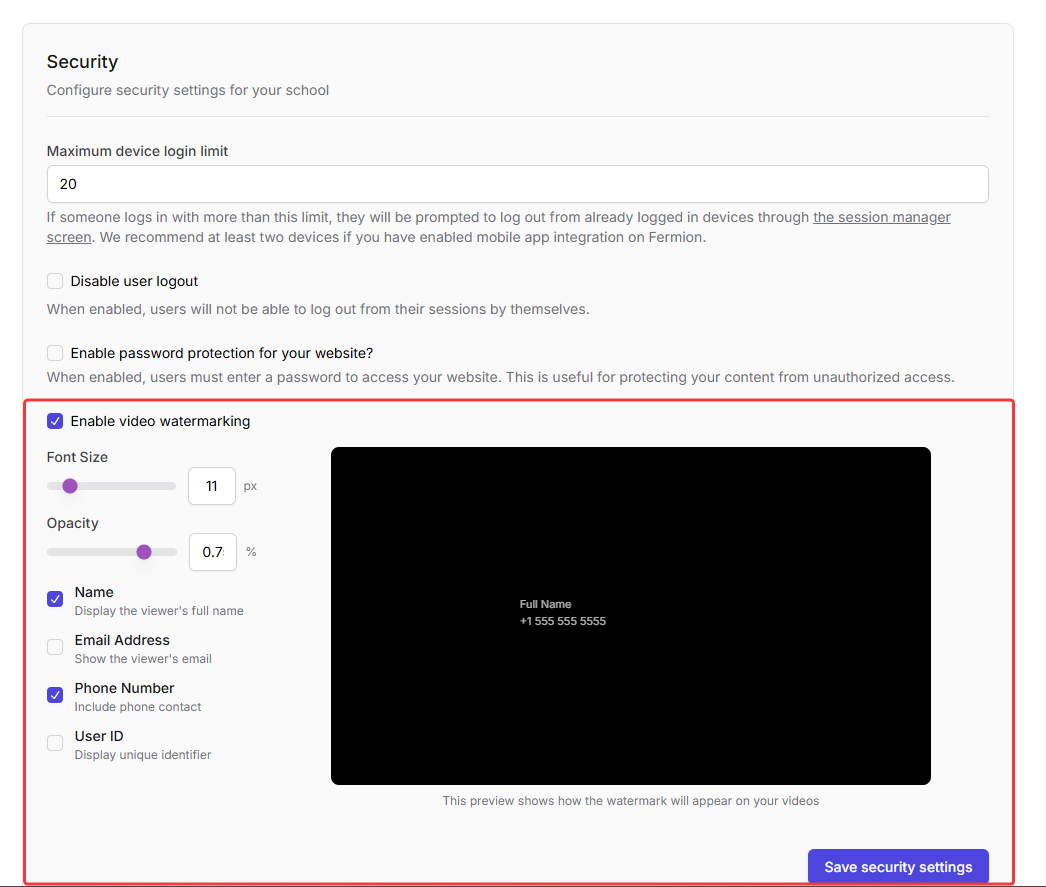 Review the live preview to confirm how your watermark will look, then click Save Security Settings to apply changes.
