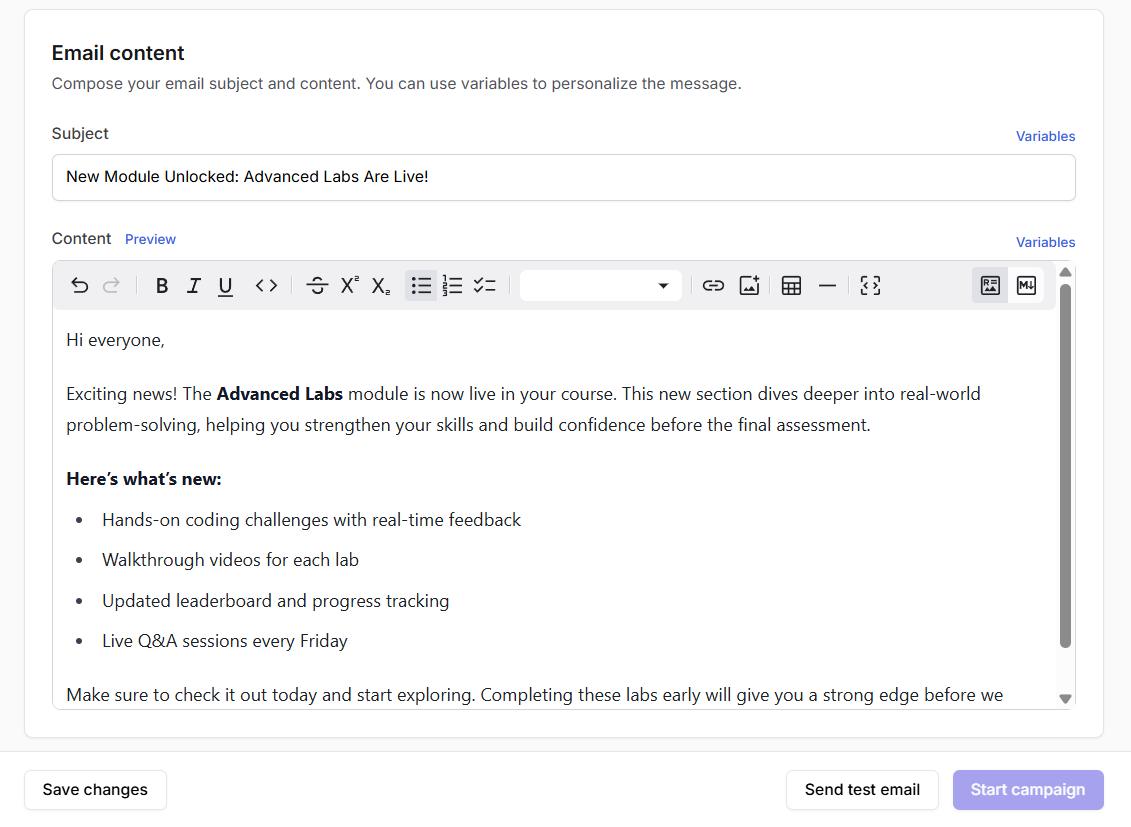 The content editor supports rich text formatting, so you can style your message, add links, and format sections to match your tone and branding.