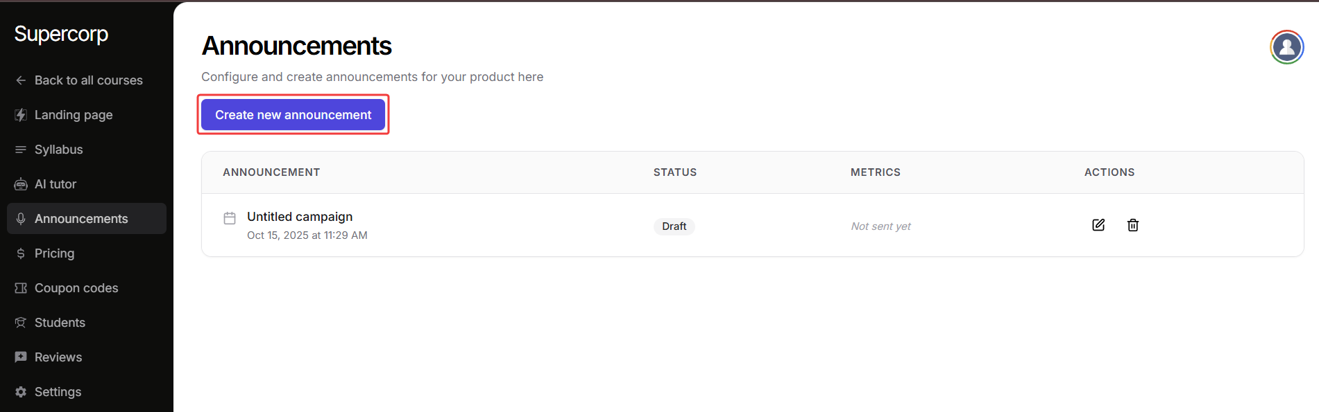From the sidebar, select Announcements and click Create new announcement to start a new campaign.