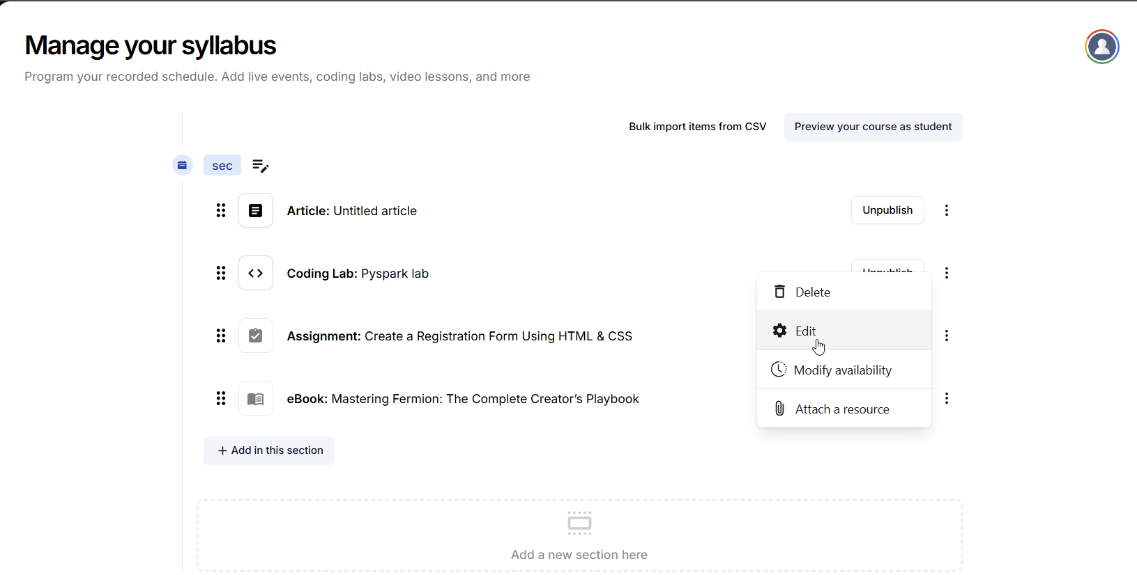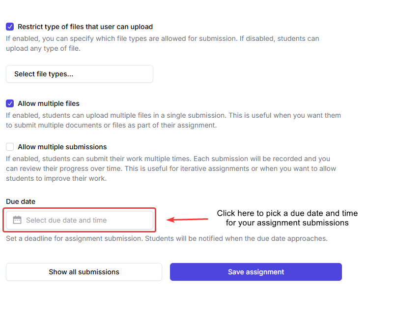 In the edit assignment section, you can view and manage all student submissions for your assignments by clicking the Show all submissions button. For each submission, you can see:- Student name and email