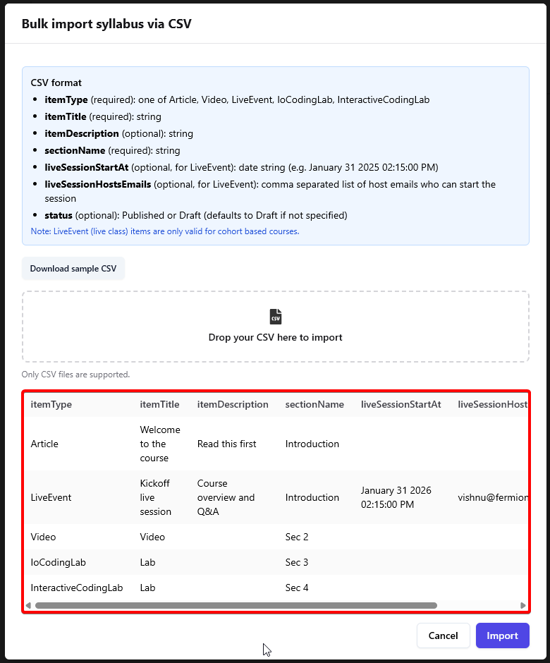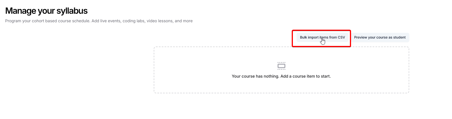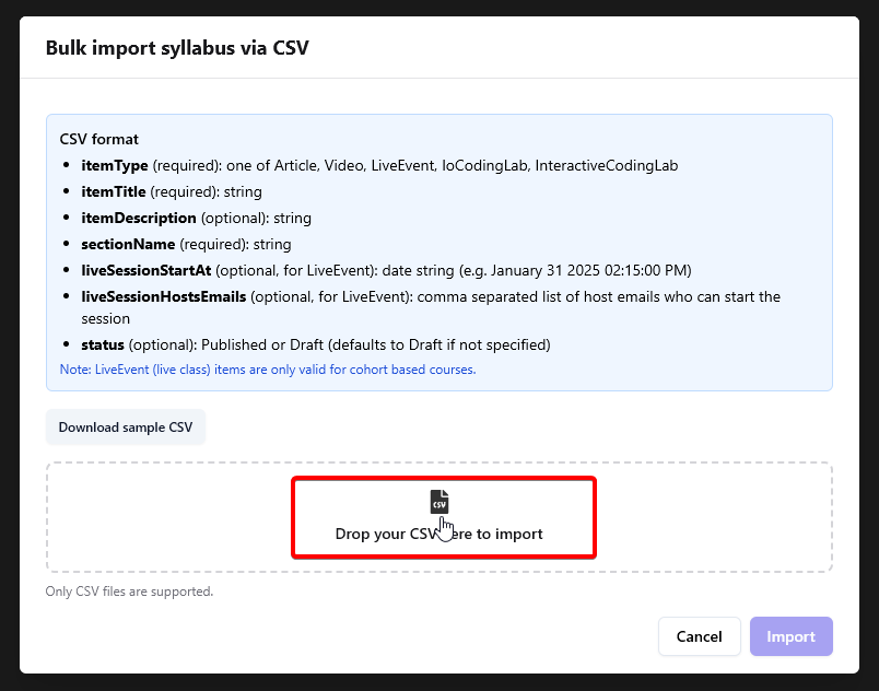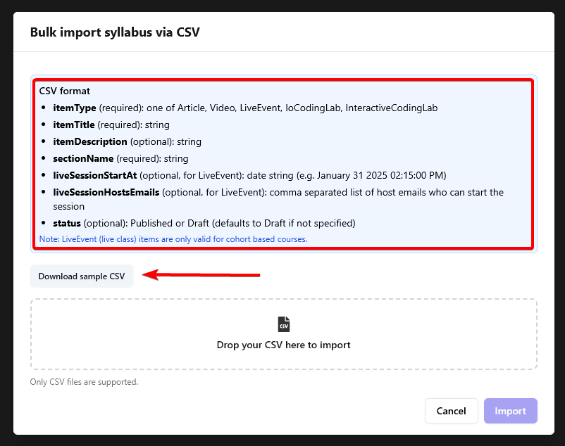 Review the CSV format requirements or download a sample CSV file for reference. Use the format guide to build your course syllabus.