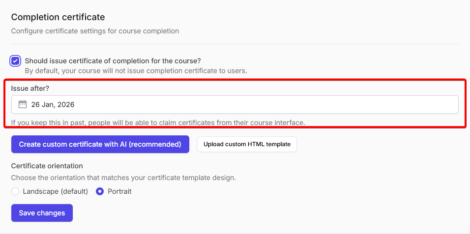 For Cohort-based courses, choose the date after which certificates will be granted to learners.