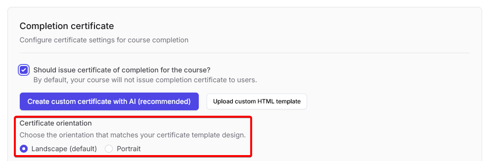 Additionally, you can manually choose the orientation of the certificate (landscape or portrait).
