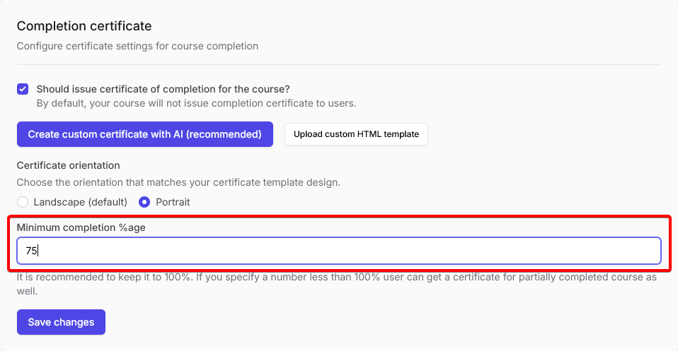 For Recorded courses, select the completion percentage at which a user becomes eligible for a certificate.