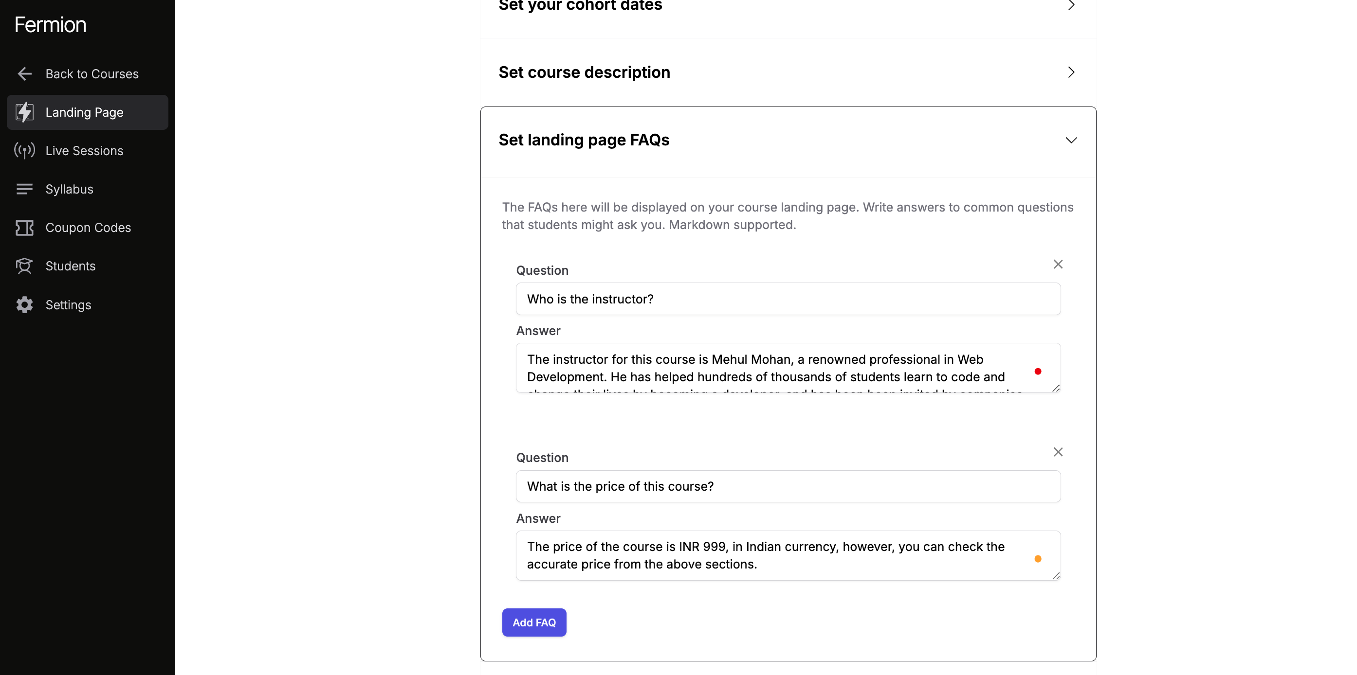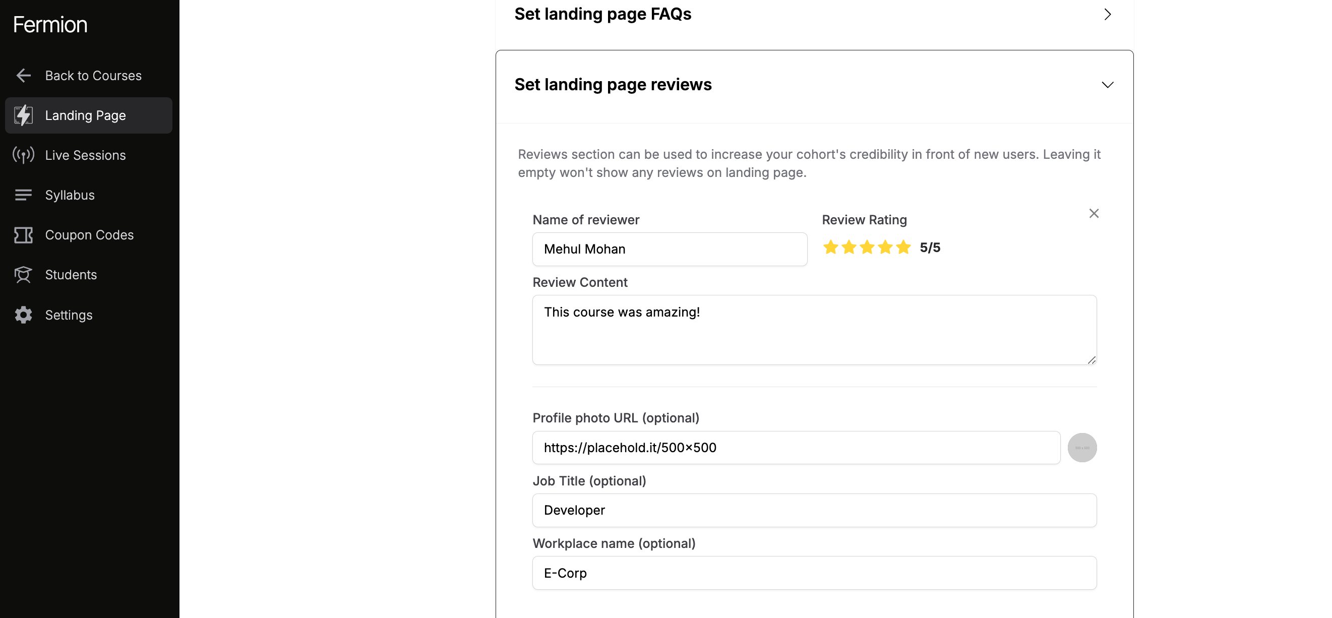 Fermion simplifies the process of showcasing reviews on your course landing page. You can create authentic reviews from scratch within the platform, giving you complete control over the content.- Reviewer’s name